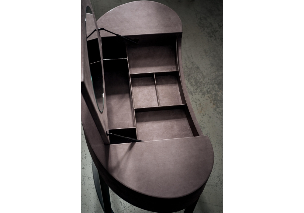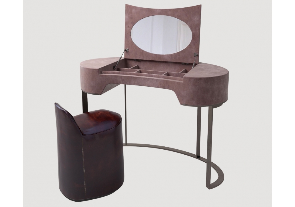 Yves conçue par Roberto Lazzeroni pour Baxter est une belle coiffeuse avec base en laiton satiné, en métal bruni fini à la main ou en métal nickelé satiné, avec vernis mat. Structure en MDF avec rêvetement en cuir. Plateau avec ouverture et miroir ovale. Structure en feuille de métal tapissée en cuir.