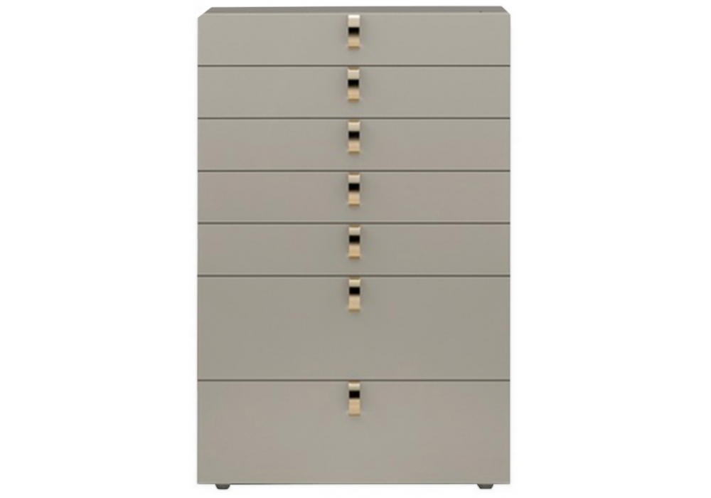 Splendor conçue par Rodolfo Dordoni pour Flou est une commode haute avec 7 tiroirs laqué brillant couleur crème ou laqué mat greige. Les poignées sont disponibles en bain or, nickel noir ou bruni mat. La série comprend aussi une table de chevet et une commode.
