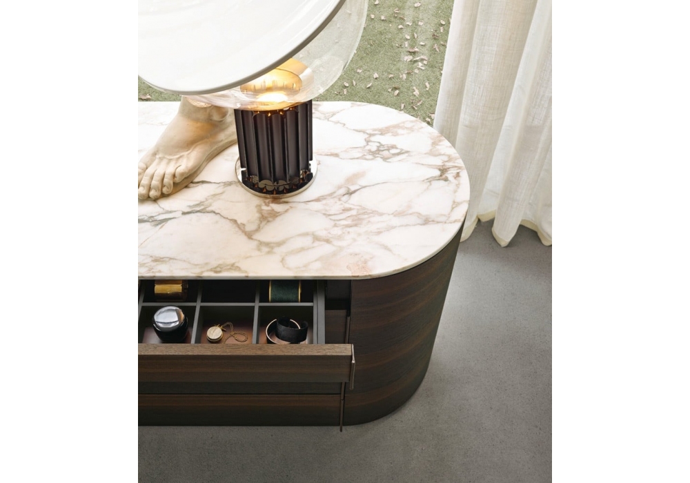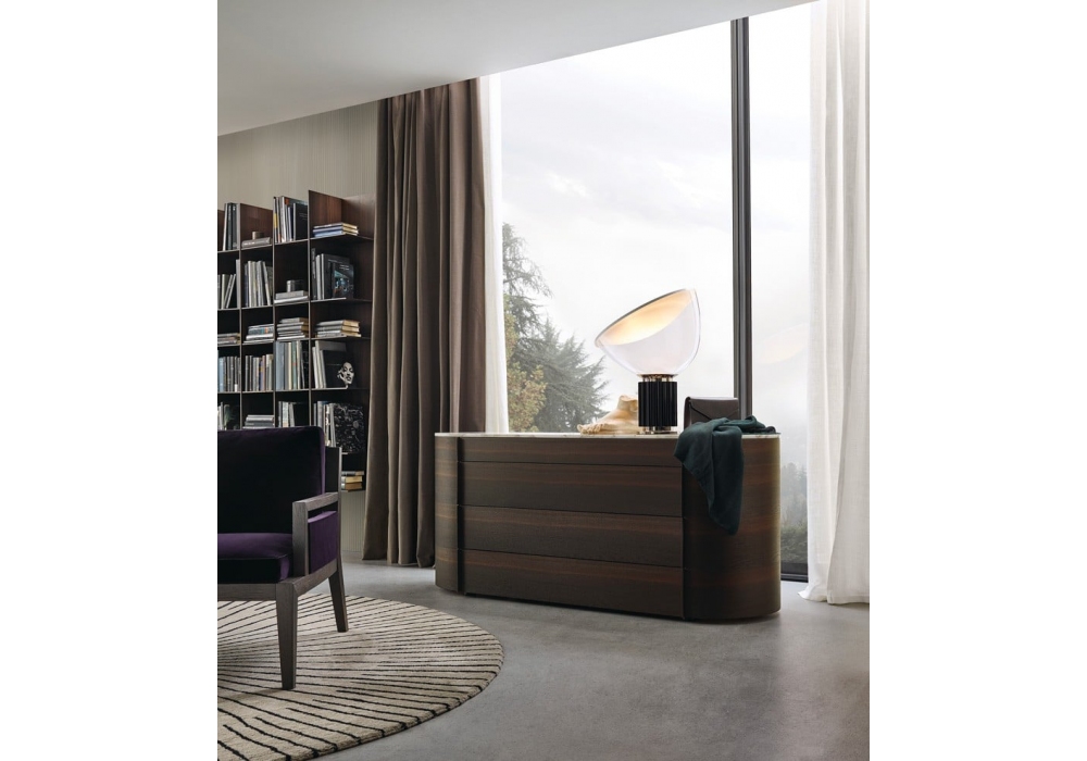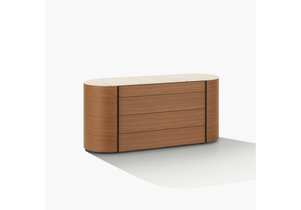 Onda conçue par R&D Poliform est une commode en bois. Tiroirs avec poignées en croûte de cuir et premier tiroir avec fond revêtu en croûte de cuir et équipé avec diviseurs.