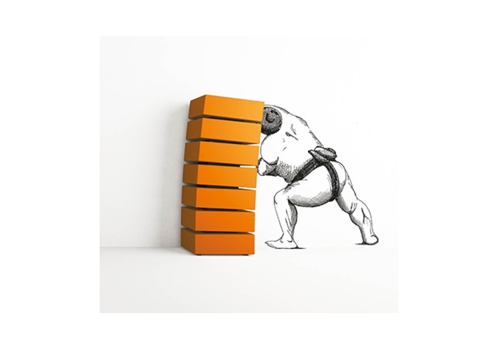 Pisa conçue par Claudio Lovadina pour Minotti Italia est une commode inclinée en bois à sept tiroirs. Finition des tiroirs disponible en différentes couleurs, entretoises disponibles dans la même couleur des tiroirs ou dans une couleur différente.