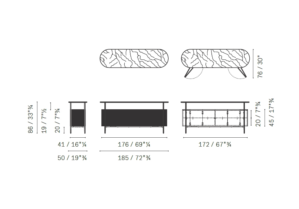 Mi conçu par Neri et Hu pour Poltrona Frau est un meuble de rangement avec une structure composée de panneaux courbes en contreplaqué de peuplier tandis que les fonds et les dos sont en contreplaqué de bouleau, le tout monté sur un cadre en métal avec une finition en acier bruni. Les portes sont fabriquées à partir de panneaux en nid d'abeille avec un cadre en bois de bouleau rempli de nid d'abeille et rembourré de panneaux MDF. L'intérieur et le bas des unités sont vénérés en noyer Canaletto. Un cadre en noyer massif Canaletto affine tout le bord supérieur. Le dessus du meuble est en verre trempé, tandis que le dessus surélevé est en marbre.