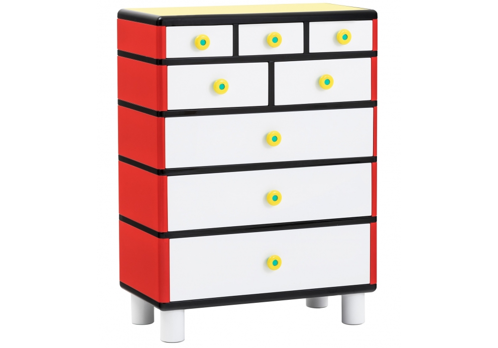 Rosa conçue par George J. Sowden pour Memphis Milano est une commode en bois laqué, plateau en stratifié plastique.