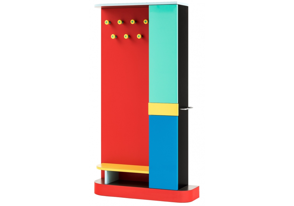 Iris conçu par George J. Sowden pour Memphis Milano est un meuble de rangement avec cintres en bois laqué et stratifié plastique. Édition limitée de 25 pièces.