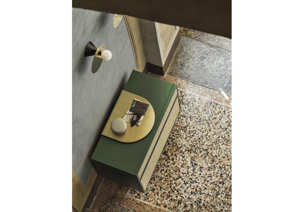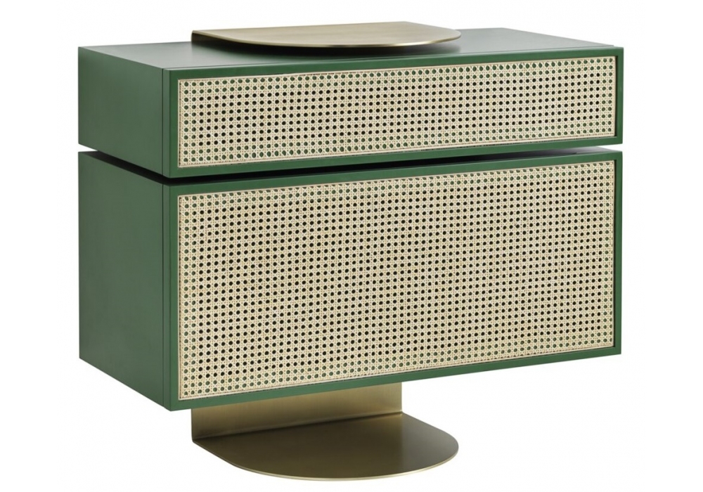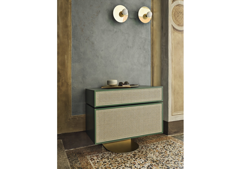 Nyny Drawers conçu par Storage Milano pour Gebrüder Thonet Vienna est un meuble de rangement composé de deux modules en bois laqué, disponible en différentes finitions. Éléments décoratifs en paille de Vienne, structure en métal finition laiton satiné, à fixer au mur.