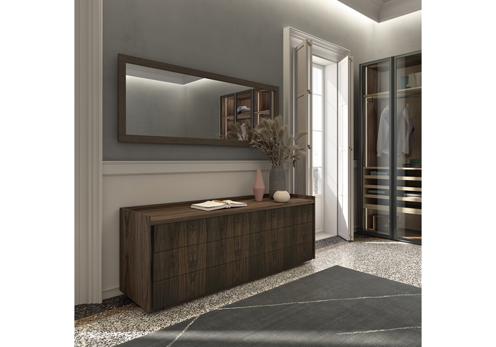 Revo Night Dresser conçu par Giuliano Cappelletti pour Riva 1920 est une commode en panneau latté et bois massif, caractérisée par un cadre qui contient le plateau, avec des tiroirs internes réalisés avec un assemblage traditionnel en queue d'aronde. Le traitement vertical particulier des façades des tiroirs, Fresart, crée un effet géométrique moderne et dynamique.