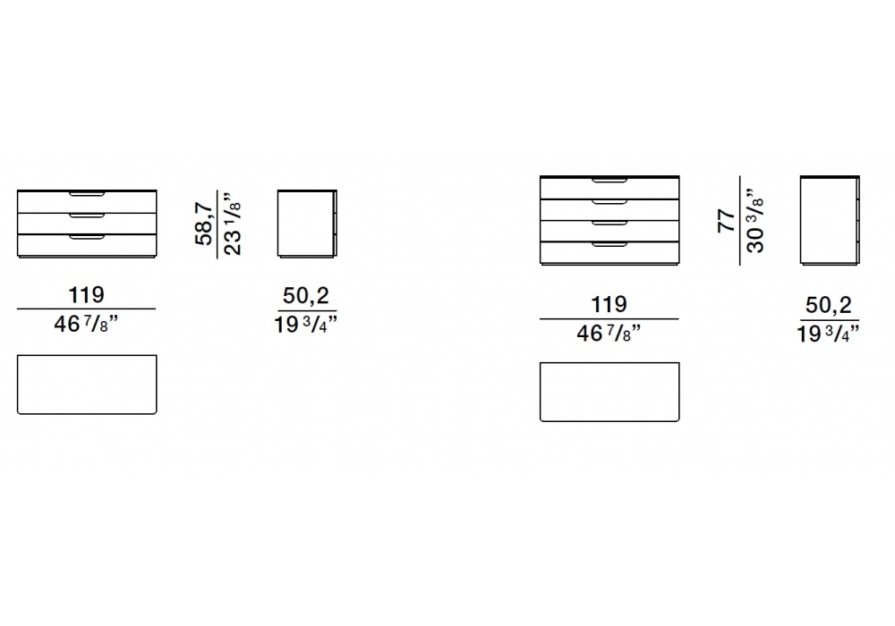 7070 conçue par Rodolfo Dordoni pour Molteni&C est une commode avec structure laquée mate et plateau en bois d'eucalyptus ou marbre. Disponible en deux dimensions.