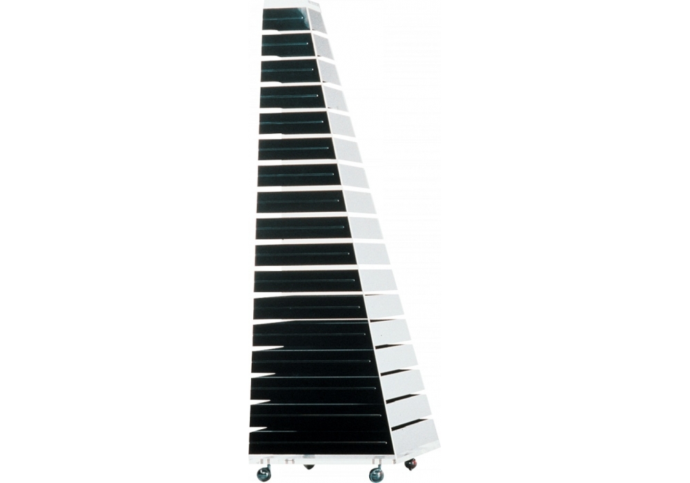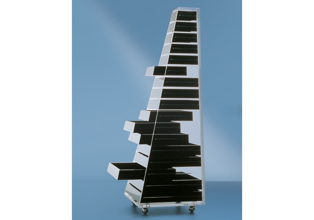 Pyramid conçue par Shiro Kuramata pour Cappellini est une commode sur roulettes avec structure pyramidale tronquée en méthacrylate transparent équipée de 17 tiroirs en méthacrylate noir.