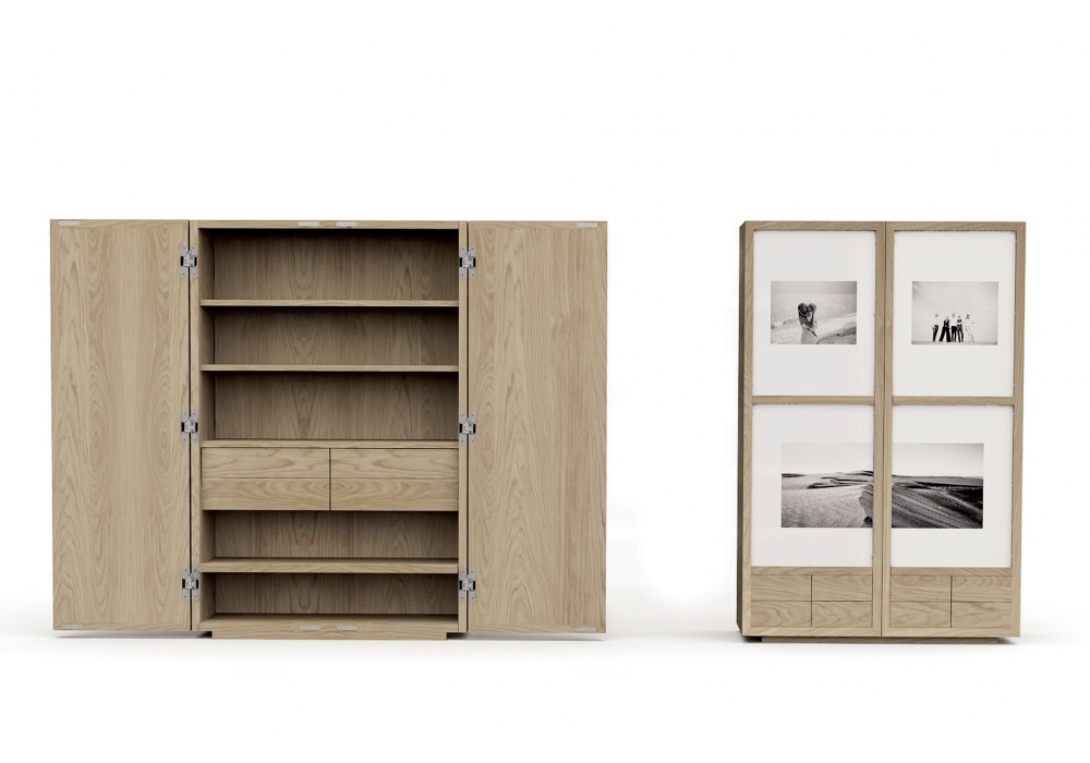 Neka conçu par Terry Dwan pour Riva 1920 est un meuble de rangement avec structure en latté, caractérisé par des portes à «cadre» conçues pour pouvoir afficher des photographies. Portes avec chant en bois massif, panneau latté avec images photographiques appliquées, avec décoration qui simule les façades des tiroirs. Intérieur avec tiroirs équipés d'un système d'ouverture push-pull et éclairage au moyen de bandes LED positionnées sur les épaules, dont l'allumage est automatique grâce à des capteurs qui s'activent à l'ouverture de la porte.