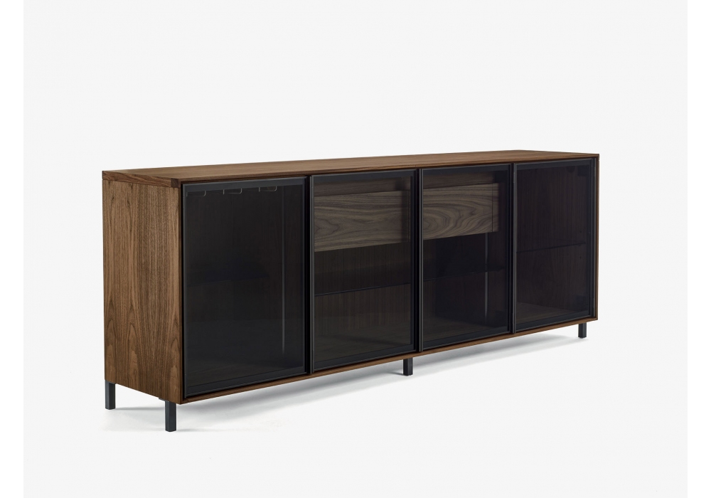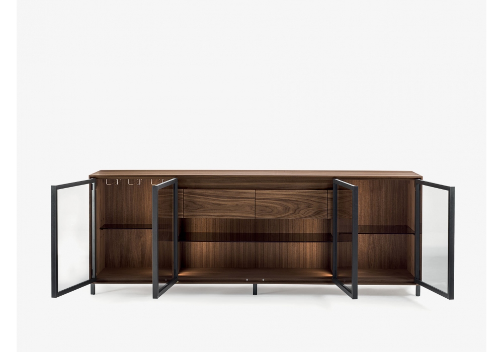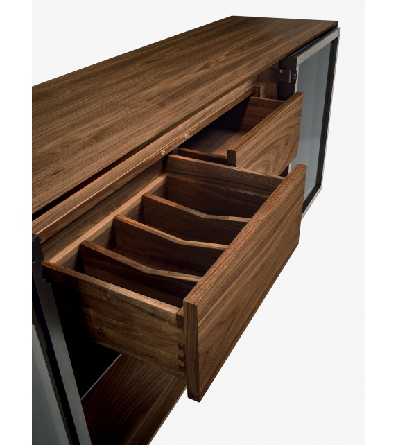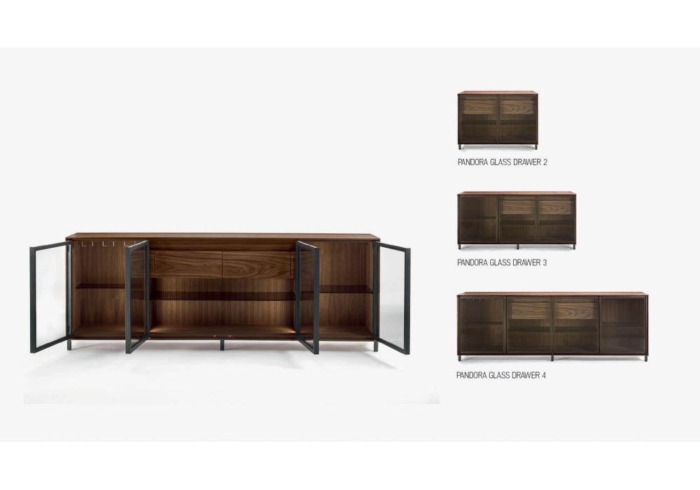 Pandora Glass conçu par Gabriele & Giuliano Cappelletti pour Riva 1920 est un meuble de rangement en latté avec portes en verre avec structure en aluminium. L'équipement interne se compose d'étagères en verre uniquement ou avec l'ajout de deux tiroirs internes en bois massif avec poignée encastrée, assemblés avec des joints à queue d'aronde. L'intérieur de l'armoire est éclairé au moyen de bandes de LED positionnées sur les épaules centrales, dont l'allumage est automatique grâce à des capteurs qui s'activent à l'ouverture des portes.