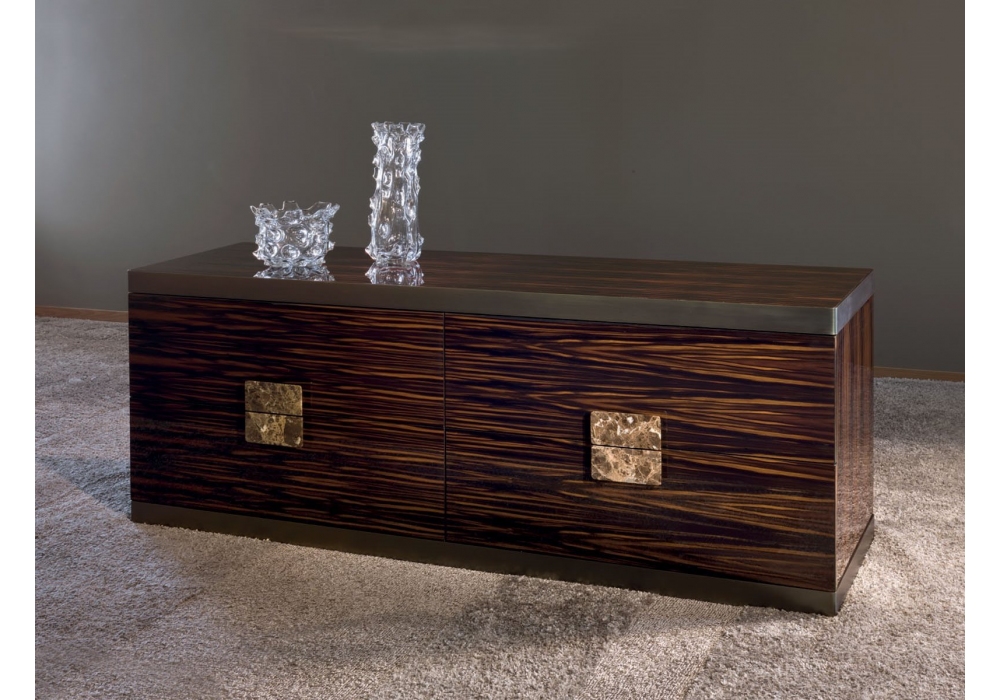 Evelyn conçue par Giuseppe Viganò pour Longhi est une commode à 4 tiroirs, avec structure en bois et structure en métal rectifié. Manipule les différentes billes. Il est possible de recouvrir les tiroirs de cuir.
