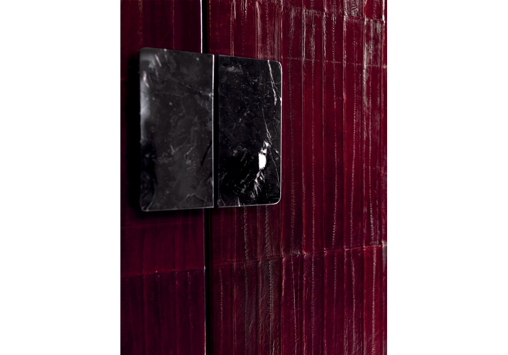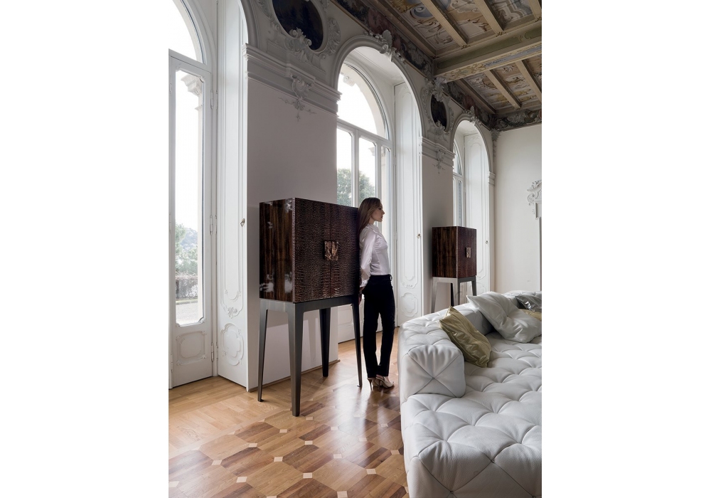 Lady conçu par Giuseppe Viganò pour longhi est un meuble haut avec structure en bois en essence ou laqué brillant, portes en bois avec revêtement en cuir ou cachemire avec poignées en marbre. Intérieur recouvert de satin avec une étagère en verre et éclairé par des lumières LED. Base en métal au sol.