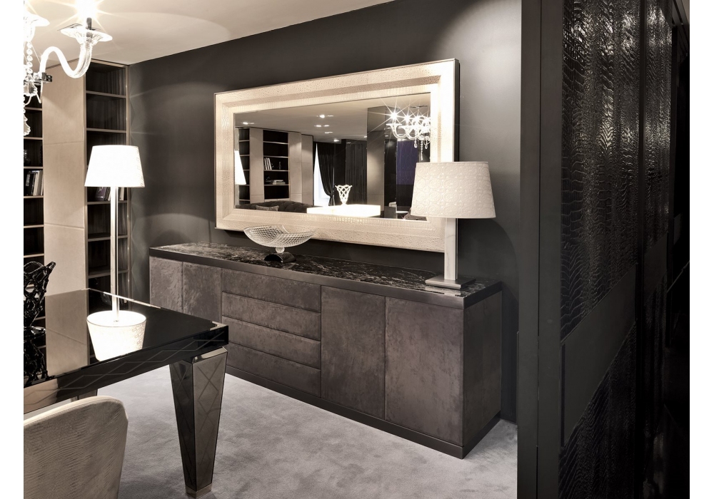 Baku conçue par Giuseppe Viganò pour Longhi est une meuble conteneur avec des parties métalliques (base et bord inférieur) en métal moulu, structure recouverte de cuir avec plateau en marbre, placage de bois ou miroir. Sur demande, il est disponible dans la version avec côtés et façades en bois recouverts ou entièrement en essence de bois.