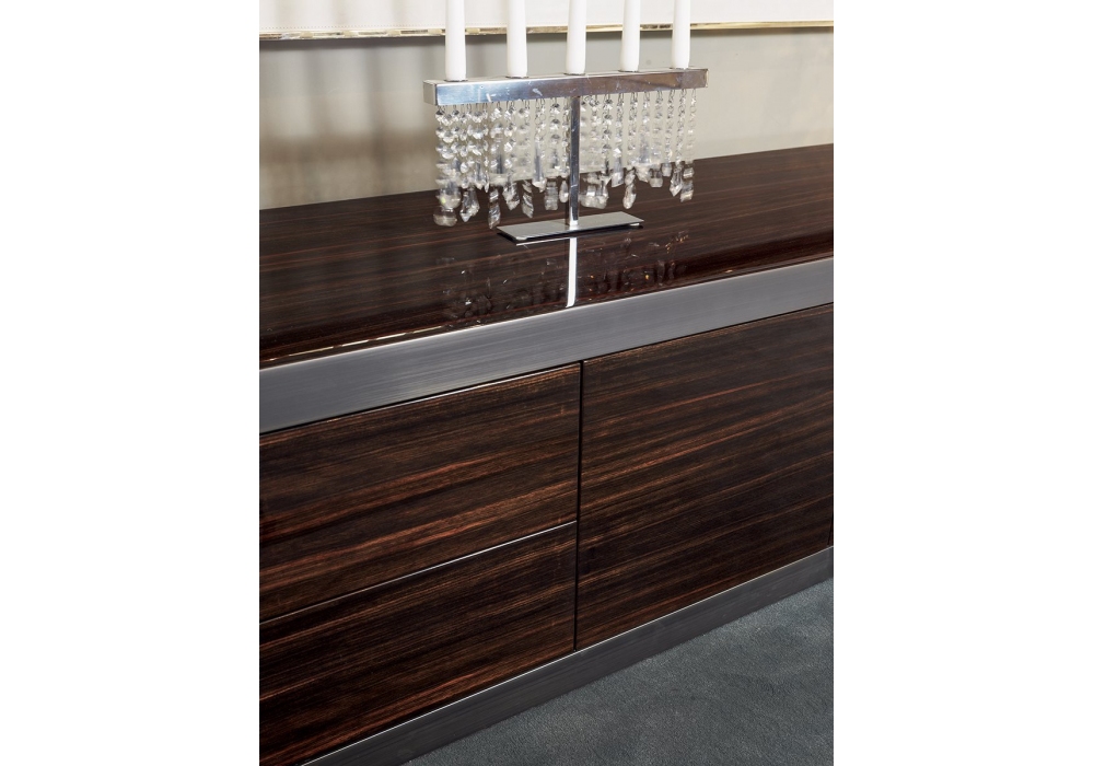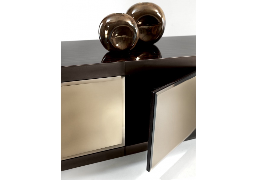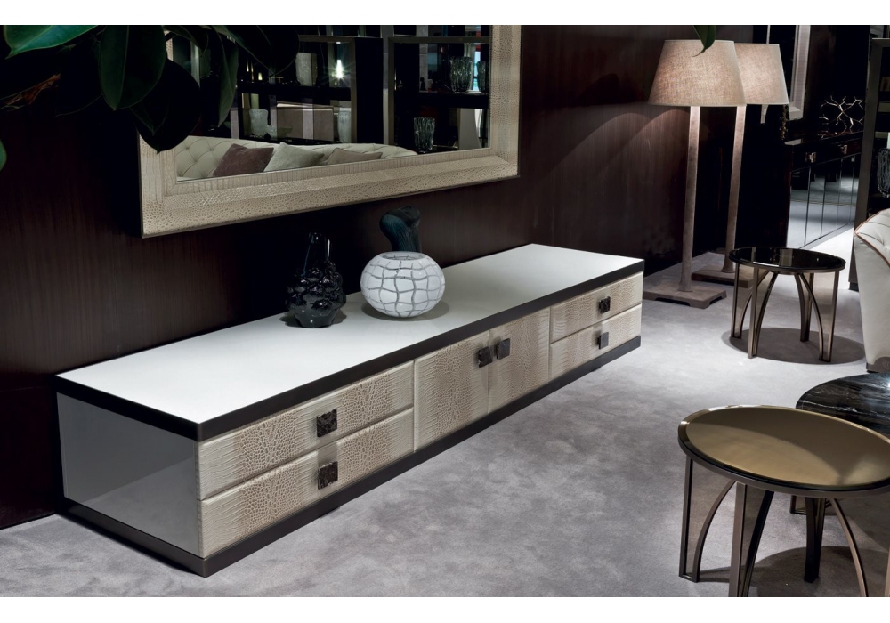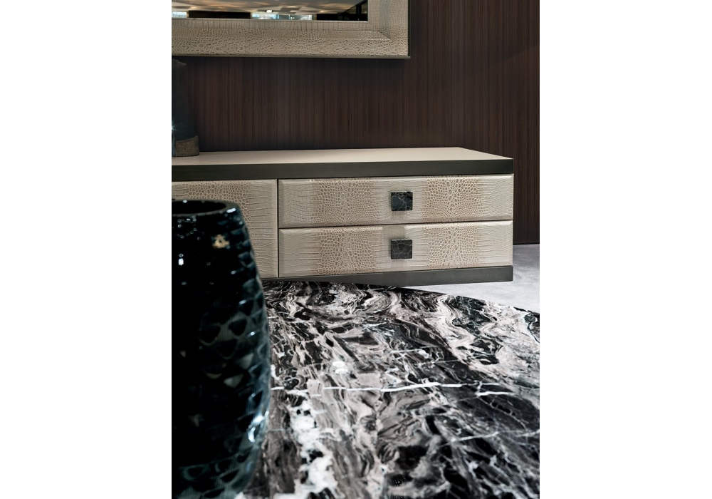 Aspen conçu par Giuseppe Viganò pour Longhi est un meuble de rangement avec parties métalliques (base et bord inférieur) en métal rectifié, structure en bois laqué brillant et façades en cuir. Plateau en marbre ou miroir. Sur demande, il est disponible avec une structure entièrement en bois.