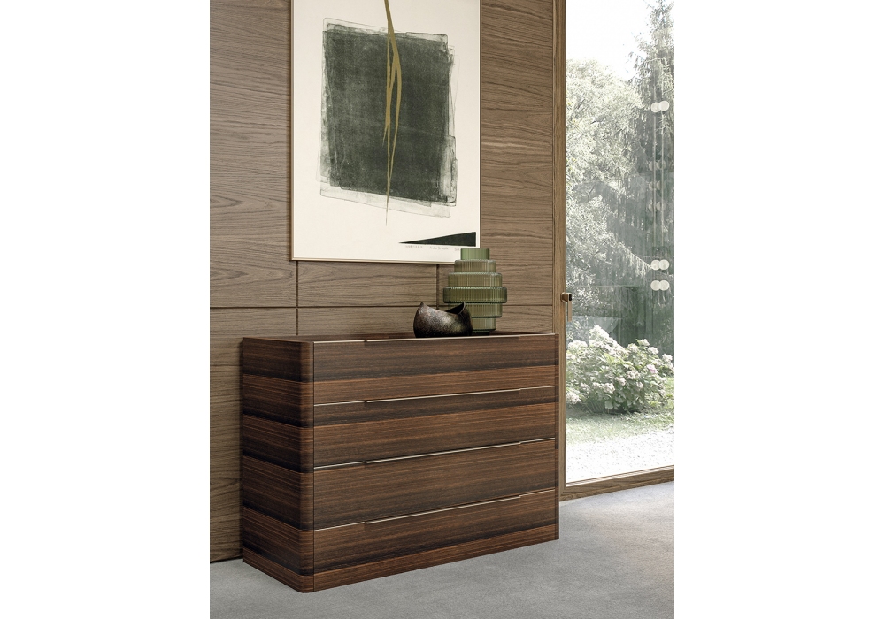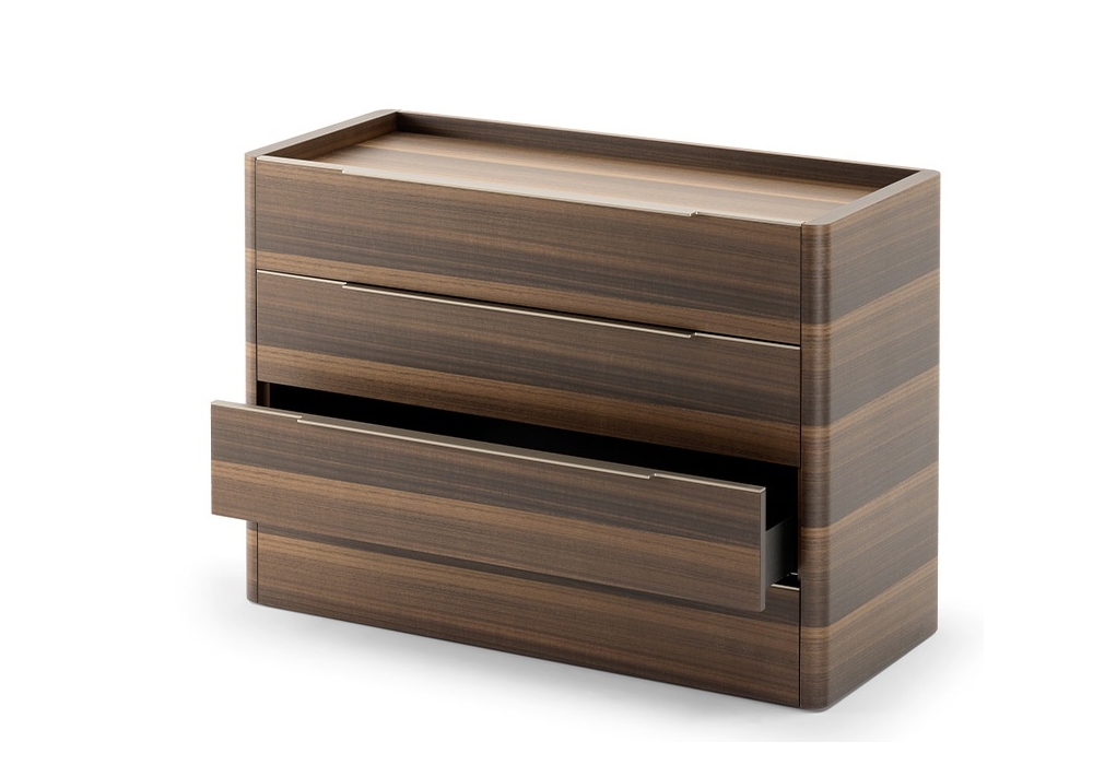 Domus conçue par Matteo Nunziati pour Turri est une commode avec structure en MDF et panneaux de particules plaqués d'eucalyptus traité thermiquement. Plateau en verre ou en bois. Il est possible d'ajouter des accessoires pour les tiroirs.