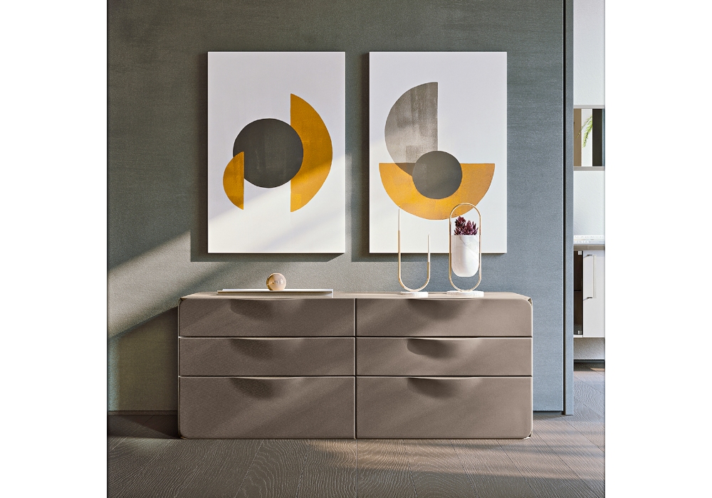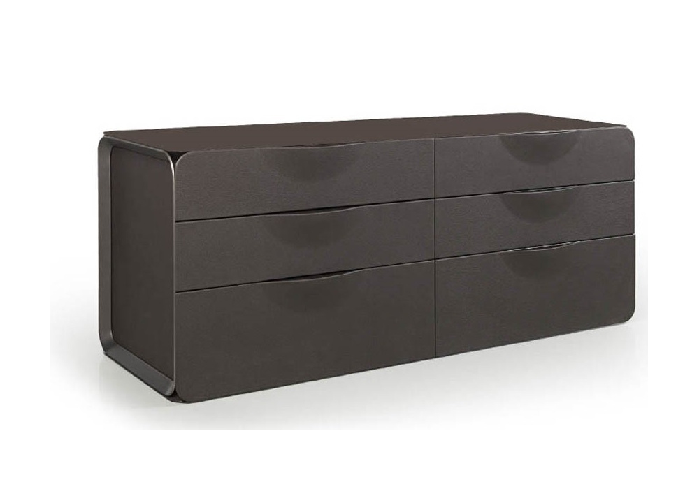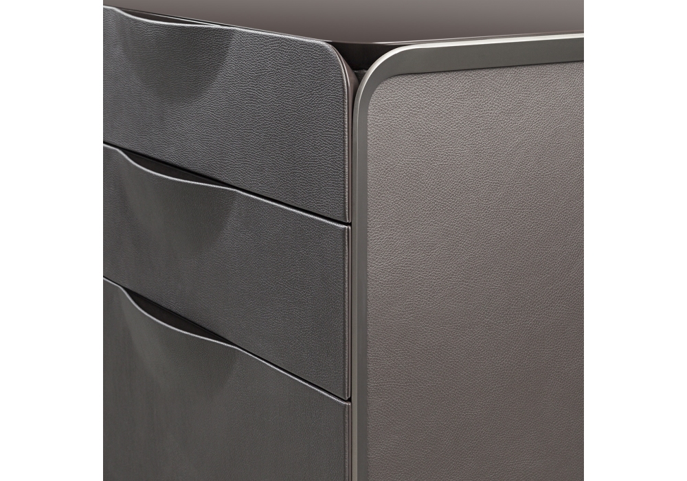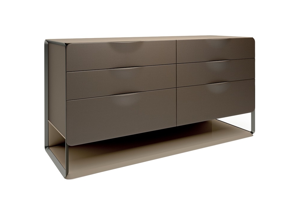 Milano conçue par Blengini Ghirardelli pour Turri est une commode avec structure en MDF et contreplaqué recouvert de différents cuirs. Le plateau est en bois laqué brillant. Il y a six tiroirs avec doublure en microfibre.