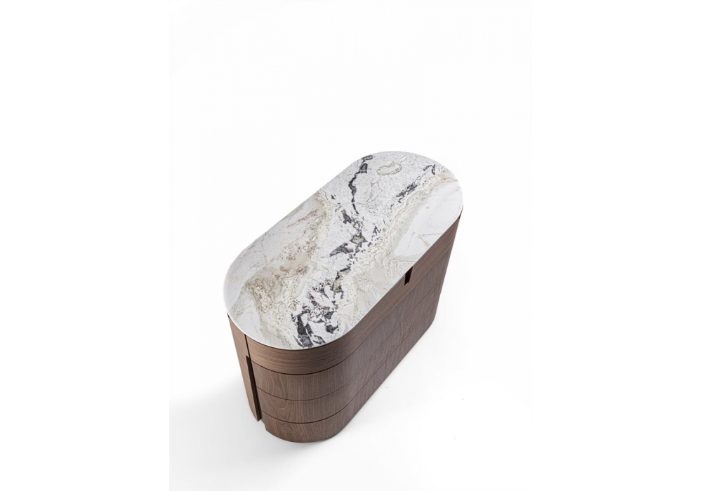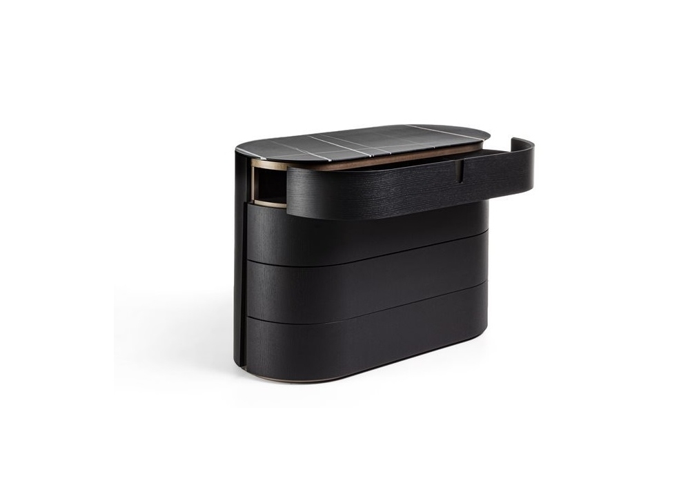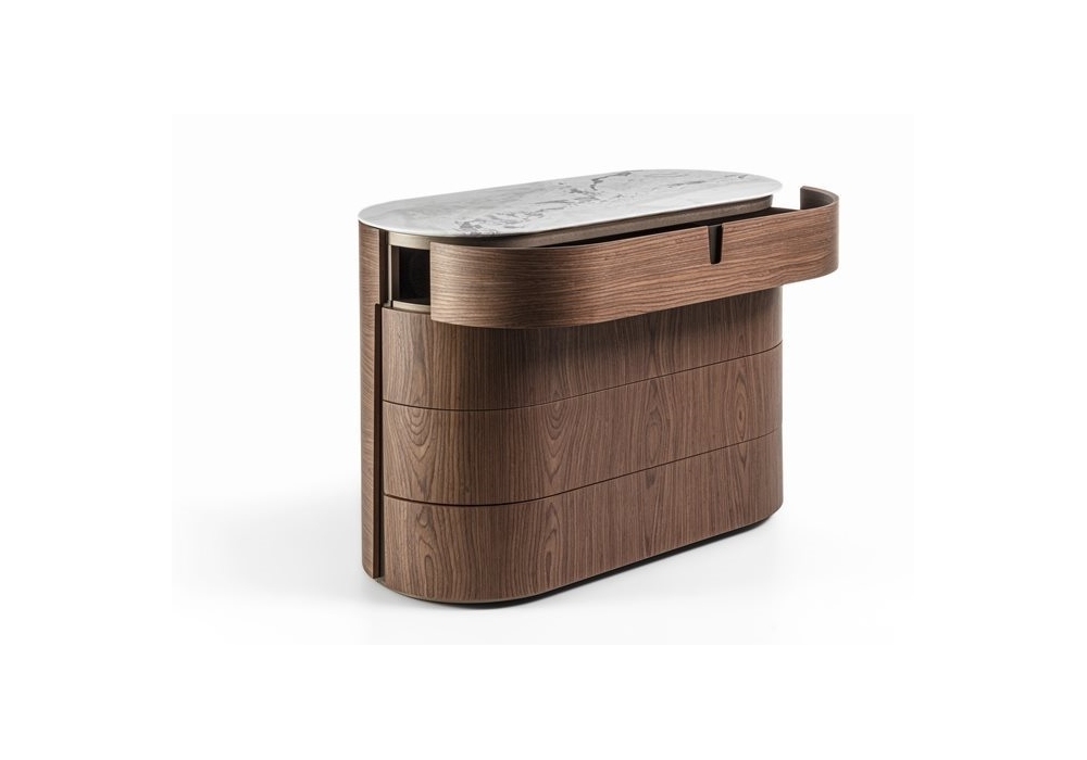 Tylsa Night 4 conçue par D. Radice pour Porada est une commode à quatre tiroirs avec structure en frêne ou noyer canaletta. Base en métal finition Bronzoro et plateau en bois ou marbre. Poignée de tiroir supérieure encastrée avec fond en métal finition Bronzoro. Tiroir supérieur divisé en trois compartiments et tiroirs inférieurs avec ouverture push-pull. Intérieur des tiroirs en finition titane anti-rayures.