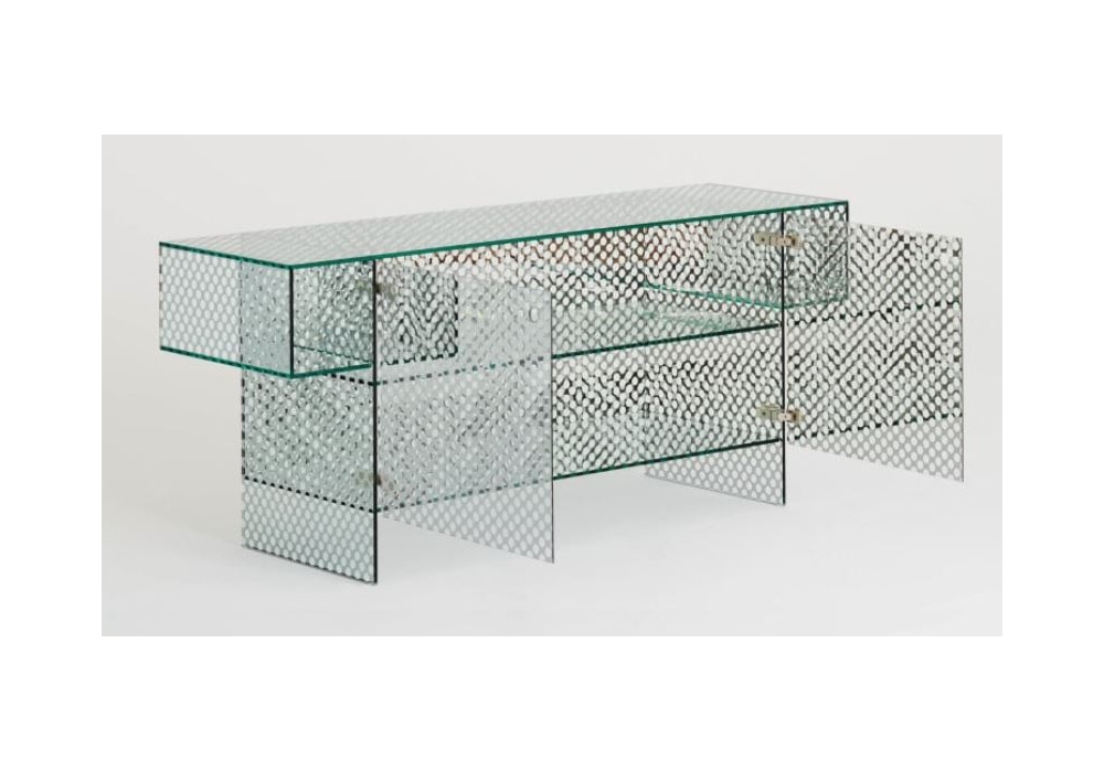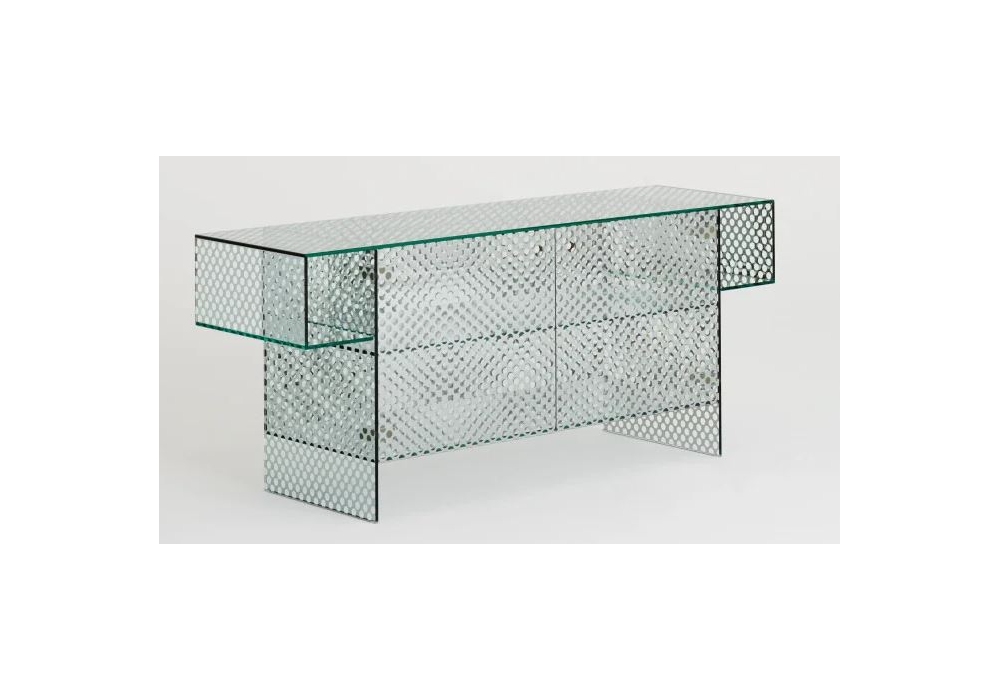 Robotin conçue par Patricia Urquiola pour Glas Italia est une console composée d'un cristal spécial miroir sur les deux faces, avec un motif décoratif de tampons transparents, qui simule une tôle perforée. Tous les cristaux sont trempés et collés aux UV.