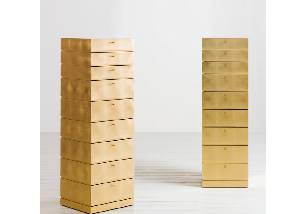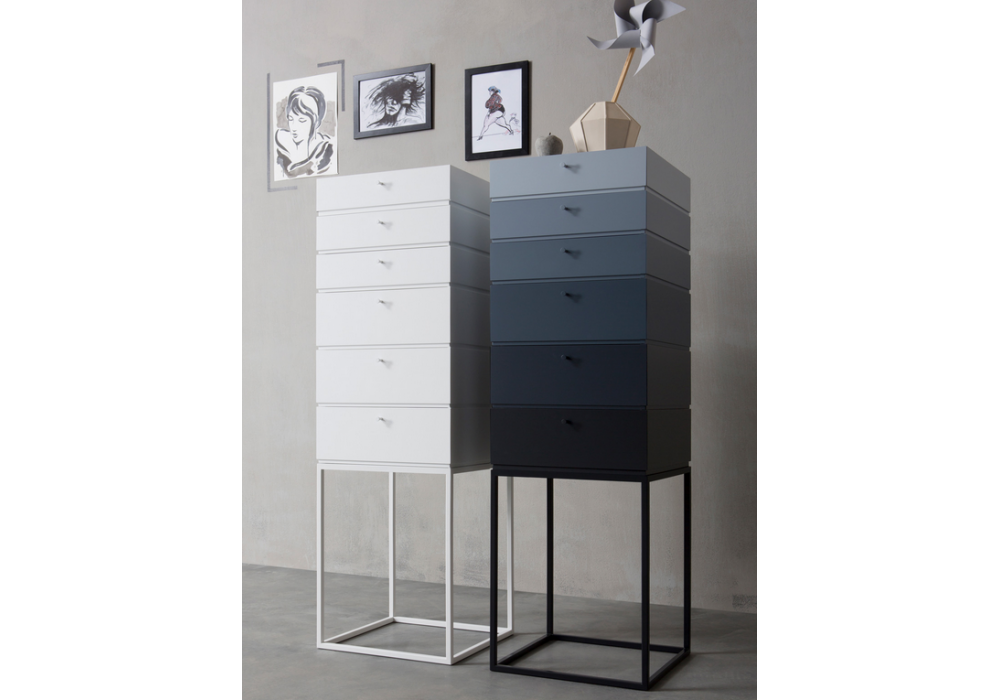 Box conçue par Manuela Pelizzon et Silvano Pierdonà pour Capodopera est une commode modulaire avec structure en MDF laqué mat et base en métal en différentes finitions.