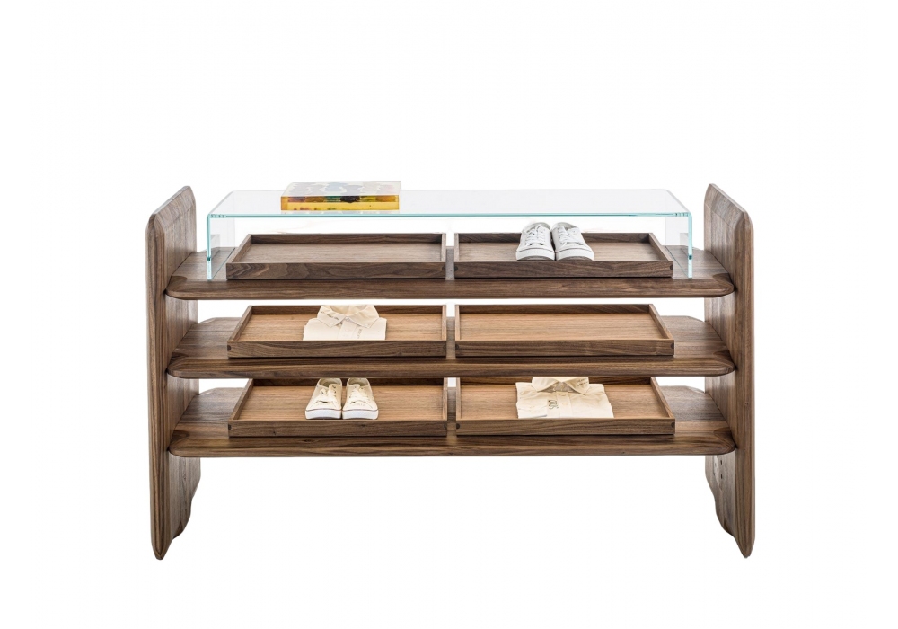 Incastro conçu par Authentic Design pour Riva1920 pour Riva 1920 est un élément conteneur composé de trois étagères qui se croisent au niveau des dossiers au moyen de joints visibles, en bois massif avec bandes collées. Disponible en différentes finitions. Sur demande, une vitrine à appliquer sur la première étagère peut également être installée.