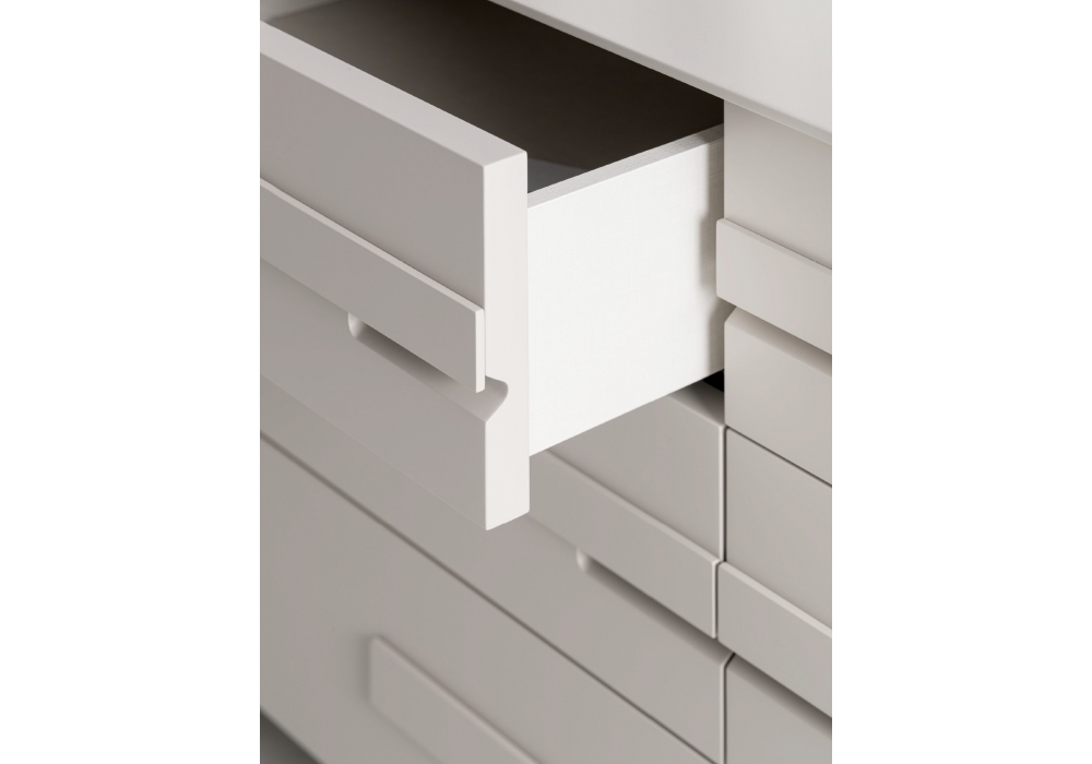 Silenzio, conçue par l’équipe R&S Désirée, est une commode pensée pour la zone nuit. Son design repose sur une succession de tiroirs mis en valeur par une poignée distinctive, qui rythme la composition de manière régulière et harmonieuse. Les formes épurées et les proportions bien équilibrées donnent naissance à un ensemble sobre et harmonieux, capable de s’intégrer avec naturel et discrétion dans les espaces dédiés au repos.