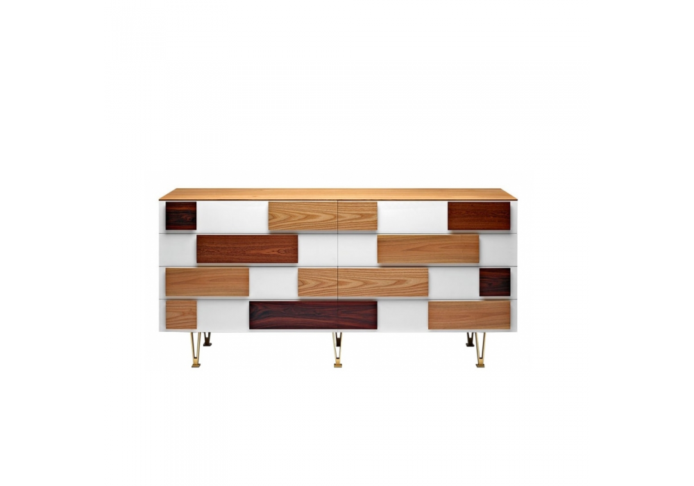 D.655.1 conçue par Gio Ponti pour Molteni&C est une commode caractérisée par des façades de tiroirs blanches peintes à la main avec des poignées appliquées de différentes essences (orme, noyer national, acajou et palissandre). La structure en bois d'orme est soutenue par des pieds en laiton satiné.