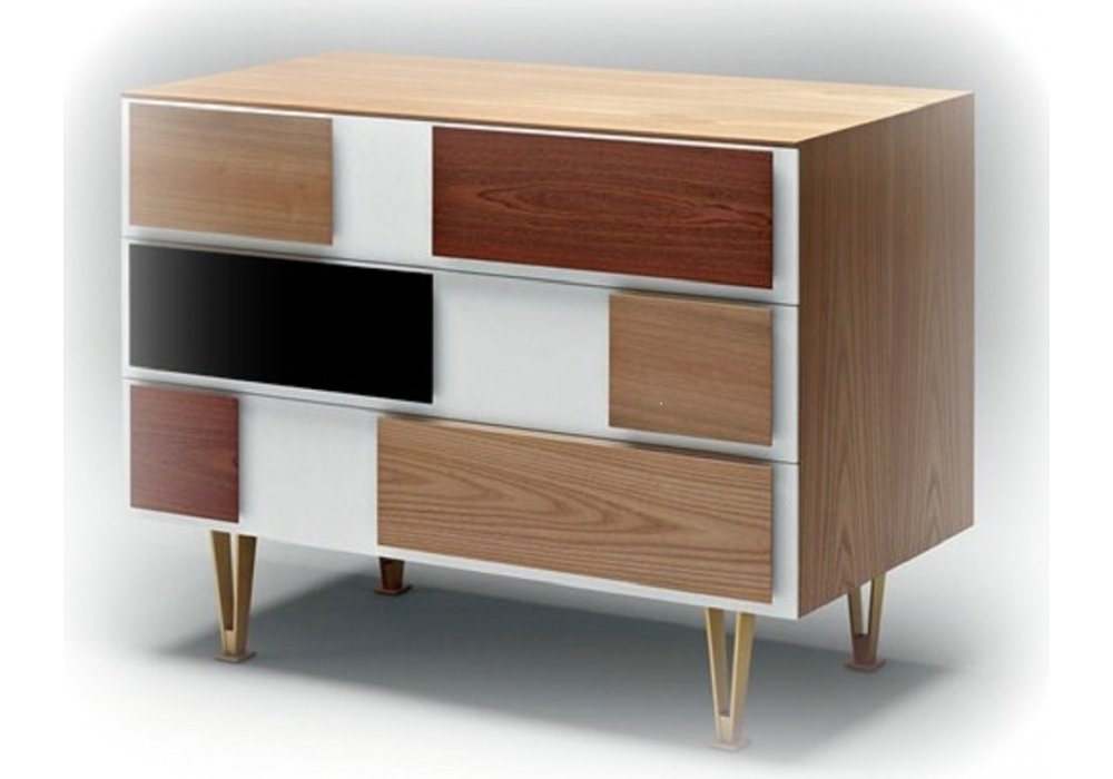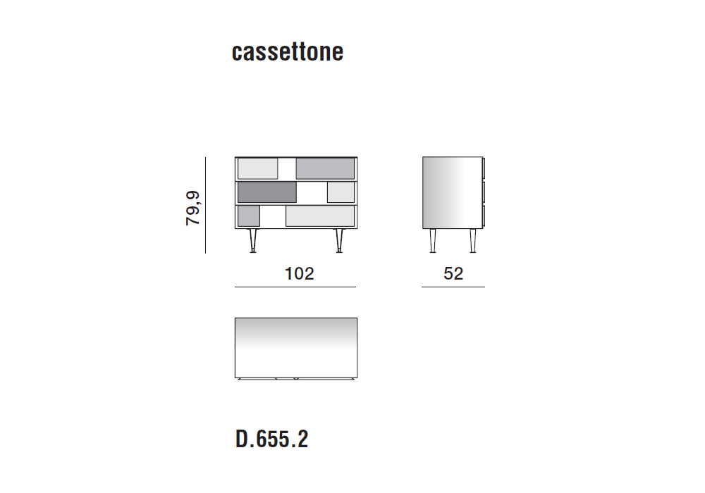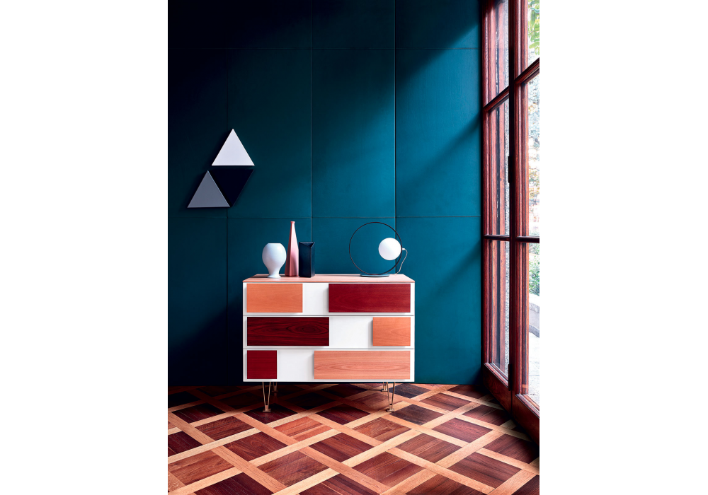 D.655.2 conçue par Gio Ponti pour Molteni&C est une commode caractérisée par des façades de tiroirs blanches peintes à la main avec des poignées appliquées de différentes essences (orme, noyer national, acajou et palissandre). La structure en bois d'orme est soutenue par des pieds en laiton satiné.