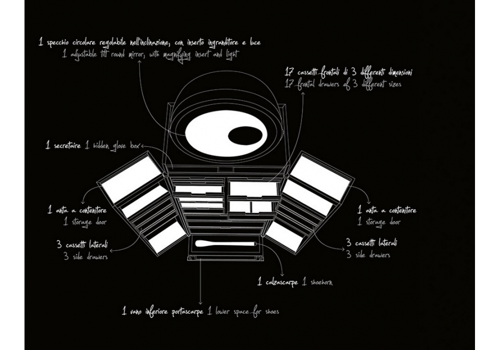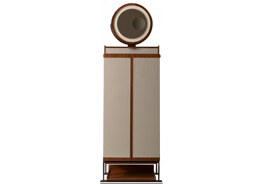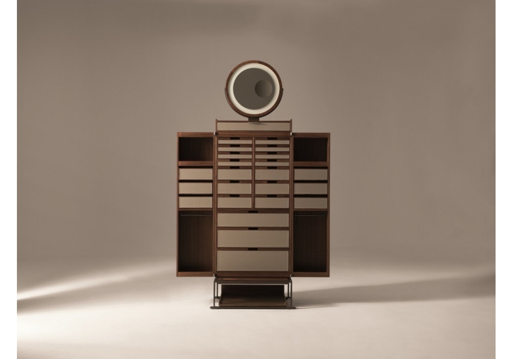 Oro conçue par Chi Wing Lo pour Giorgetti est une commode haute en noyer canaletto et inserts en cuir, avec des tiroirs de trois tailles différentes et deux portes conteneurs avec tiroirs internes et un secrétaire. Oro est disponible dans la version sans ou avec miroir circulaire, avec insert grossissant et angle réglable. Les parties métalliques et la base sont en métal peint bronze.