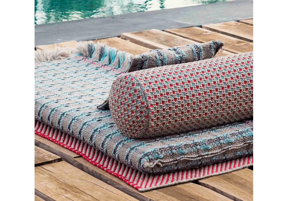 Garden Layers conçu par Patricia Urquiola pour Gan est un coussin cylindrique avec revêtement en PET 100% recyclé. 100% caoutchouc mousse rapide à séchage. Disponible en différentes finitions.