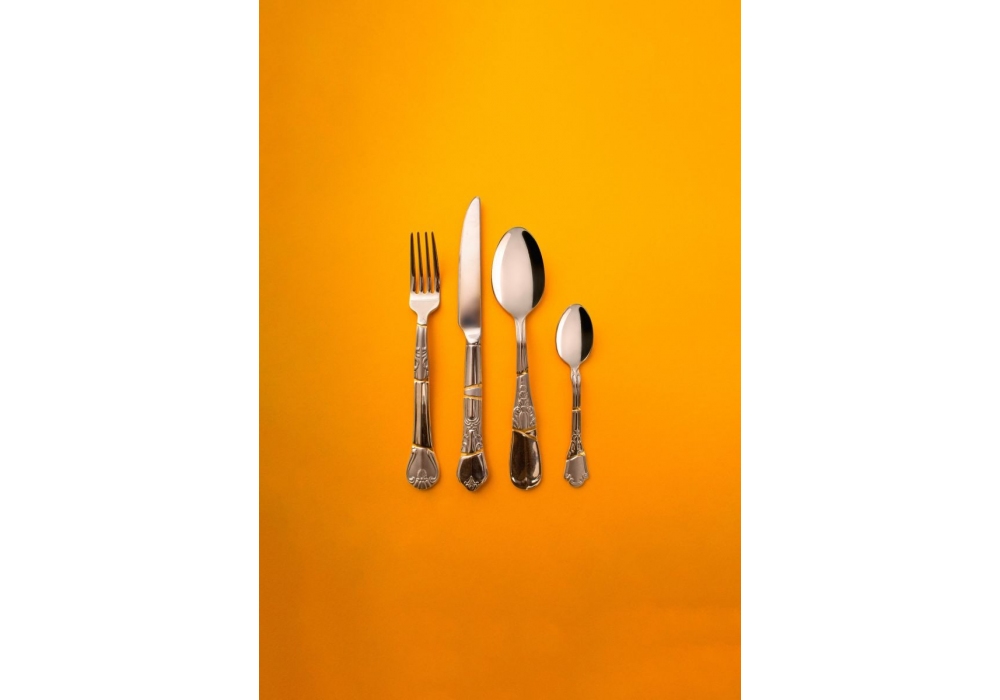 Kintsugi conçu par Marcantonio pour Seletti est un set de 4 couverts en acier inoxydable avec détails dorés.