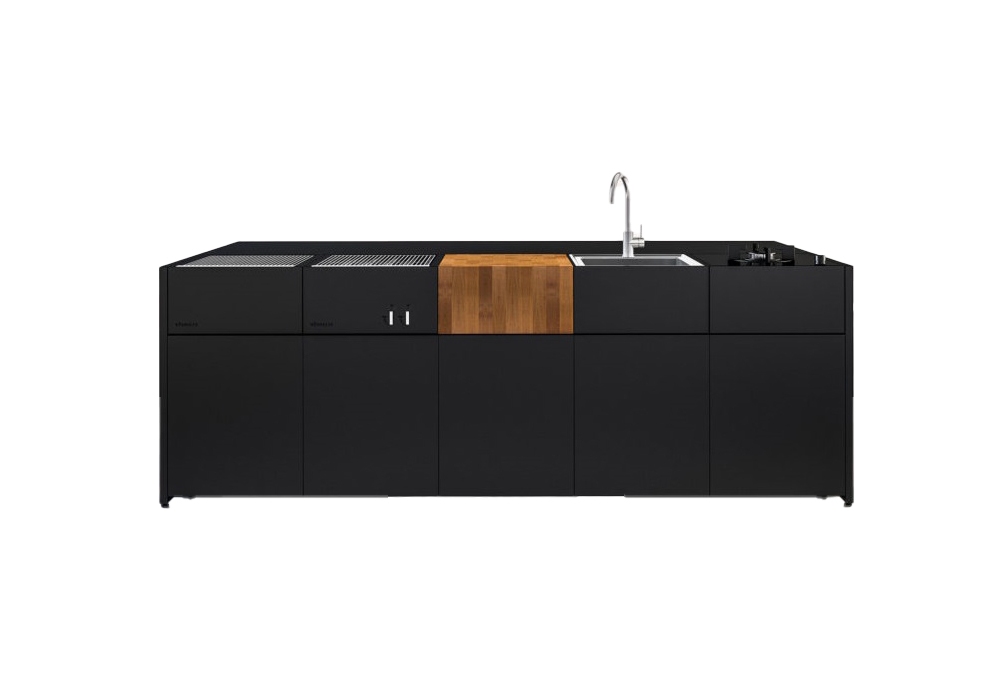 Kitchen Island conçue par Broberg & Ridderstråle pour Röshults est une cuisine modulaire d'extérieur réalisée en acier inoxydable.