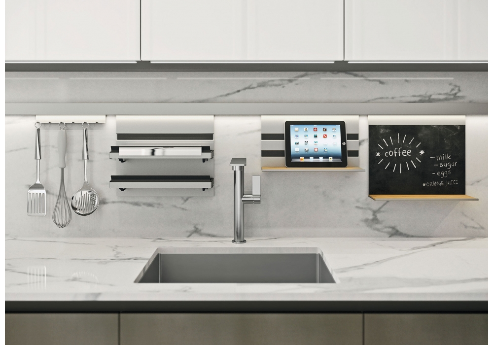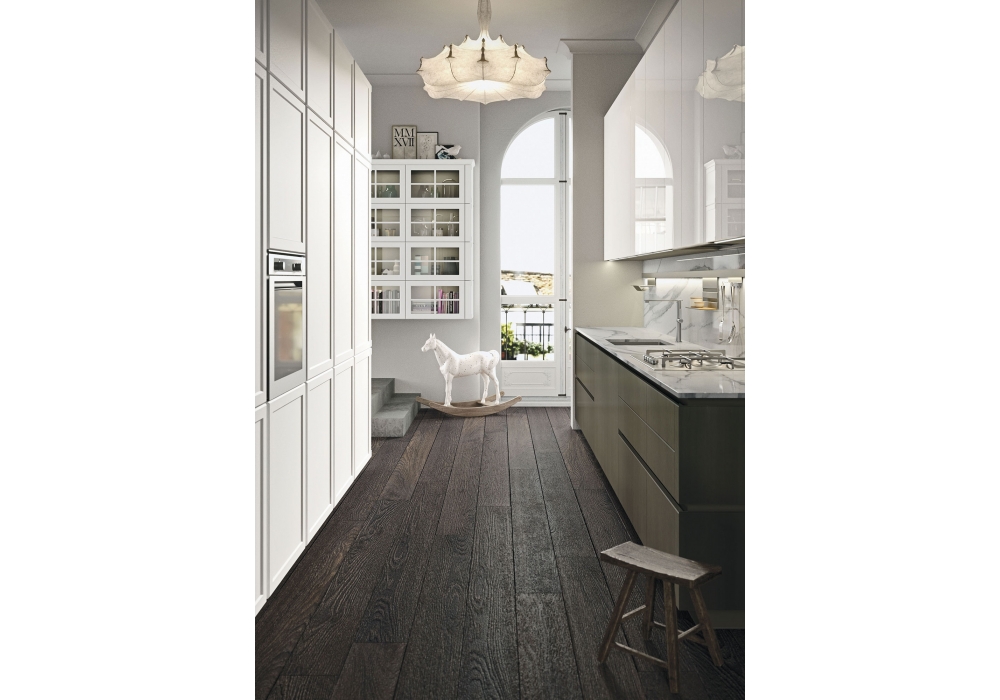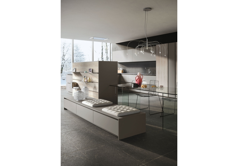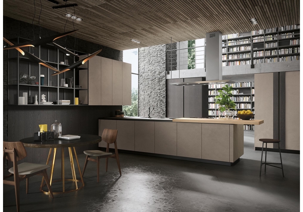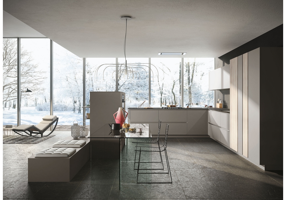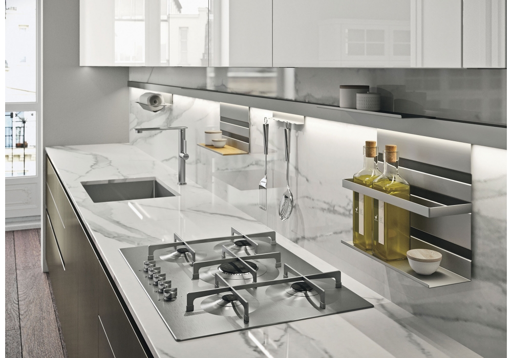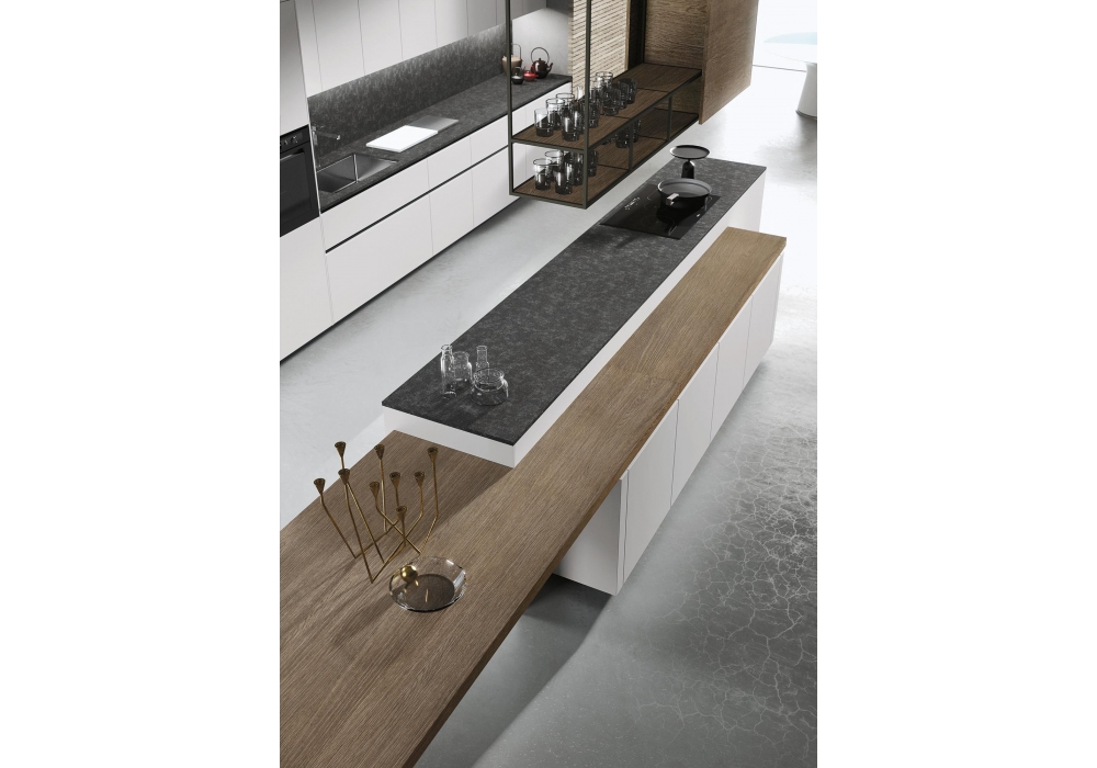 Look conçu par Michele Marcon pour Snaidero est une cuisine contemporaine qui offre la liberté de créer en fonction de l'espace disponible. Les portes peuvent être en ABS, MDF ou en bois massif. Les plateau peuvent être agglomérés pour les environnements humides, le marbre, le granit, le quartz, l'acier inoxydable, solid surface ou le bloc "board"