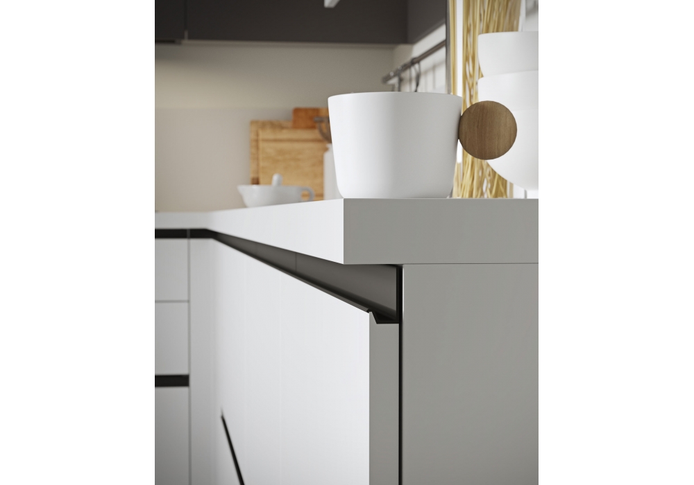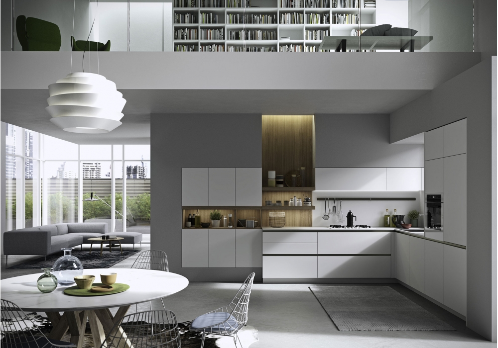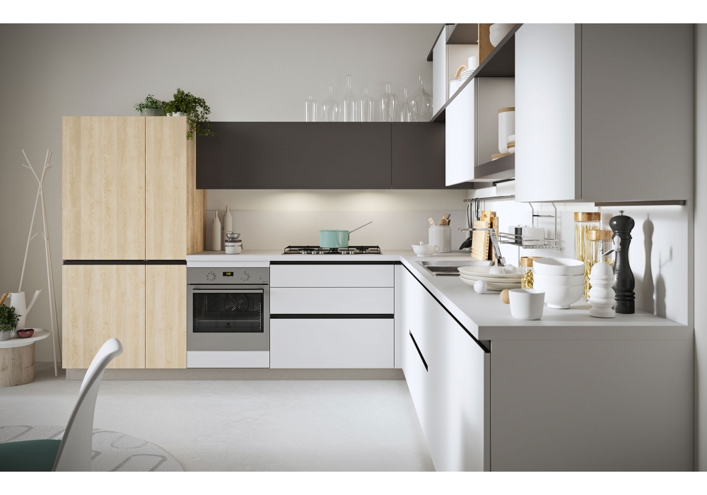 La cuisine Joy de Snaidero met en évidence les valeurs durables des matériaux et leur combinaison dans les moindres détails. Les portes sont en ABS et les plateau peuvent être en panneaux de particules pour les environnements humides recouverts de stratifié HPL résistant aux rayures ou de quartz.