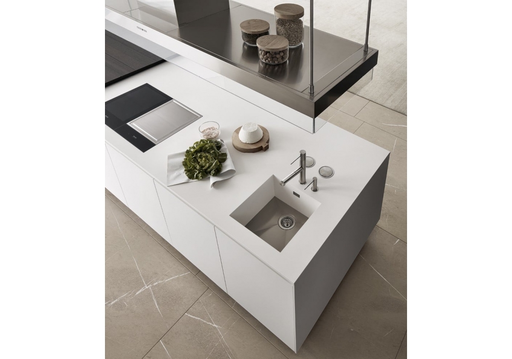 Alea conçu par Poliform est une cuisine avec une forme essentielle et un design rigoureux qui a une très grande capacité opérationnelle. Les portes peuvent être en stratifié, mélamine, laqué, acrylique, bois, acier ou verre. Les plateau en bois, stratifié, corian, acier, marbre, quartzite, pierre ou dekton. Les plateau snack en laqué, Corian, pierres, marbre, bois et stratifié.