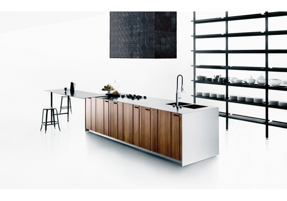 Aprile conçu par Piero Lissoni pour Boffi est une cuisine avec des hottes d'aspiration qui utilisent des systèmes d'installation innovants, des pieds en acier inoxydable pour des dessus de casse-croûte en bois pleins, des unités de stockage ouvertes-ouvertes ou des portes coulissantes et la lumière intégrée. Disponible en différentes compositions.