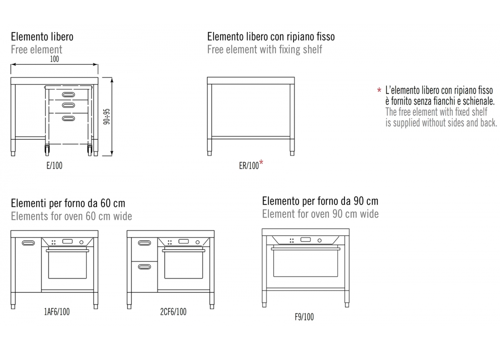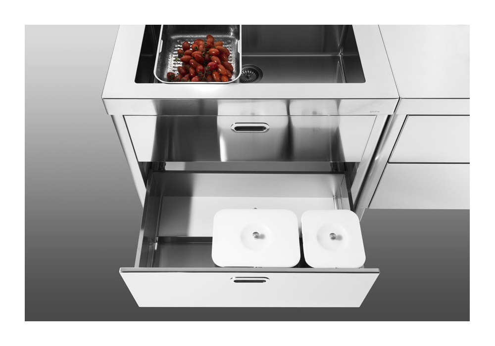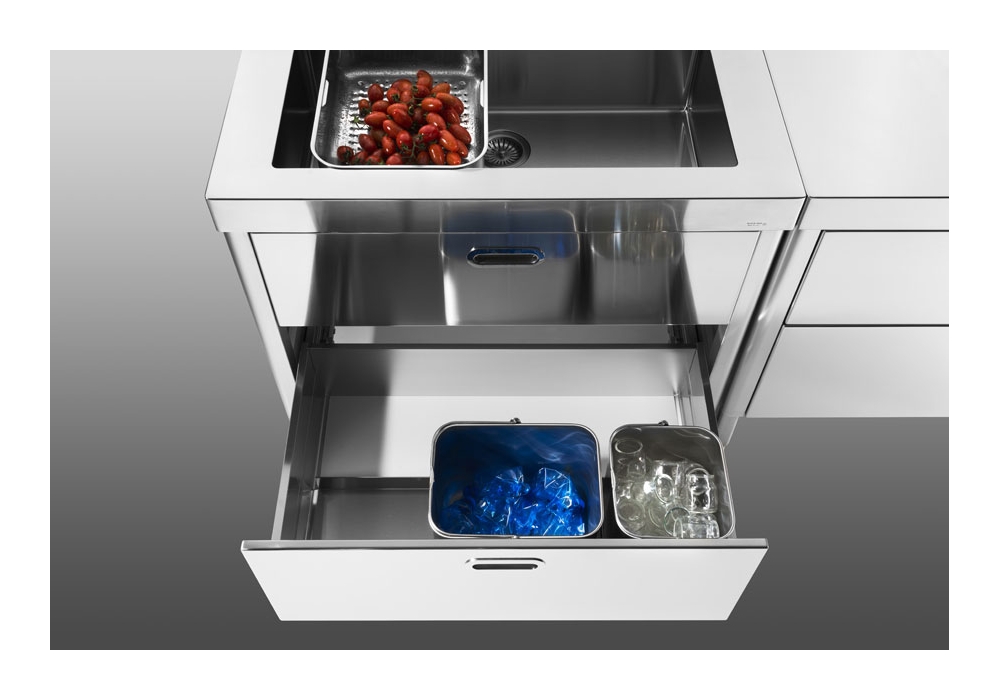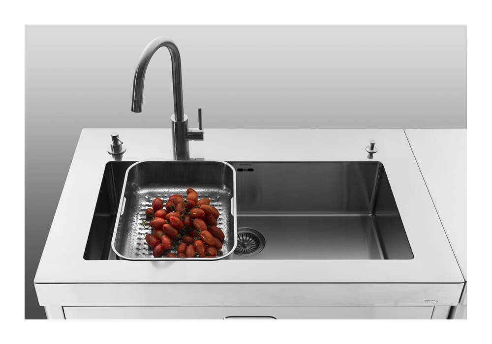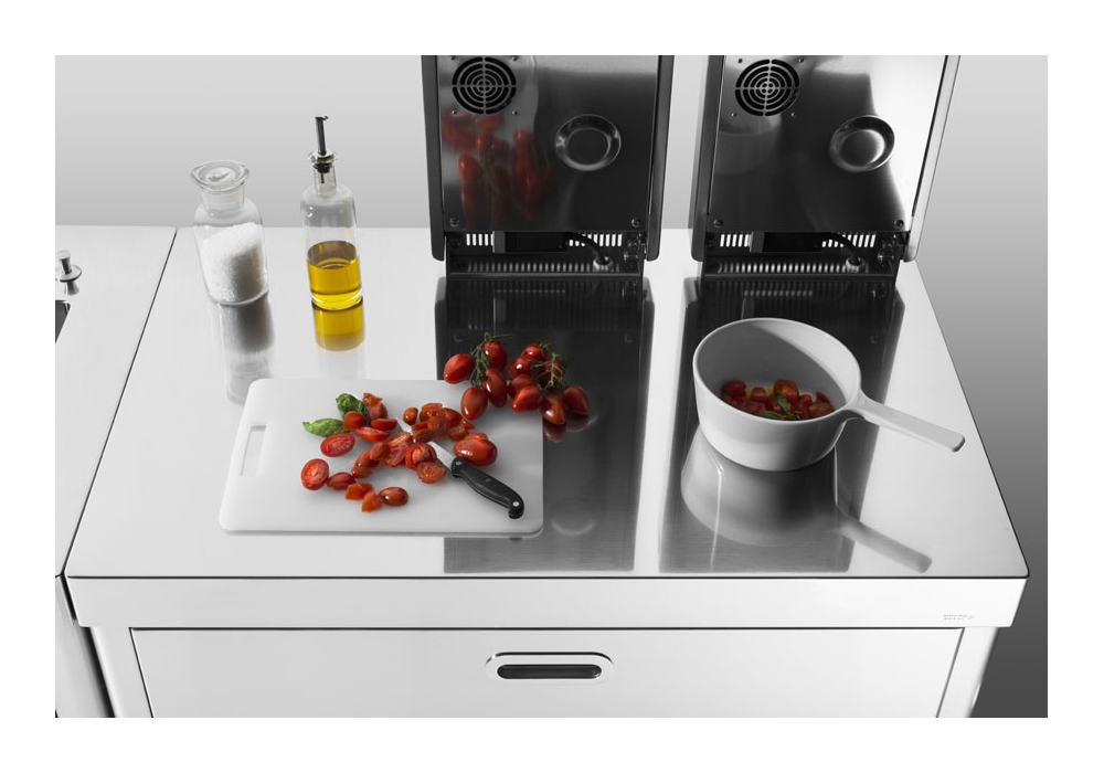 La Composition Cuisine 100 conçu par Alpes Inox, se compose de deux éléments de cuisine avec plaques à induction rabattables et bol intégré.