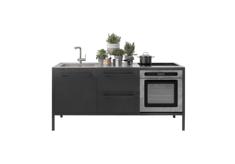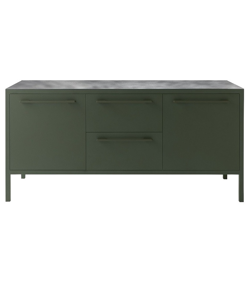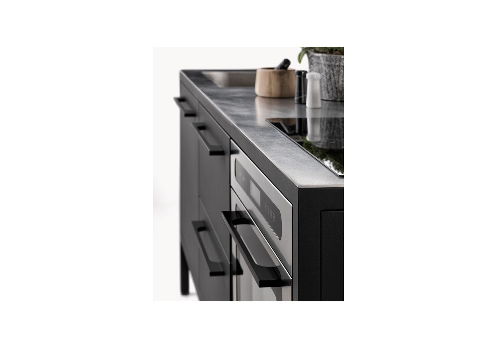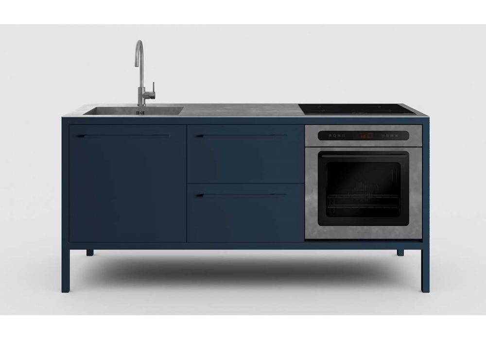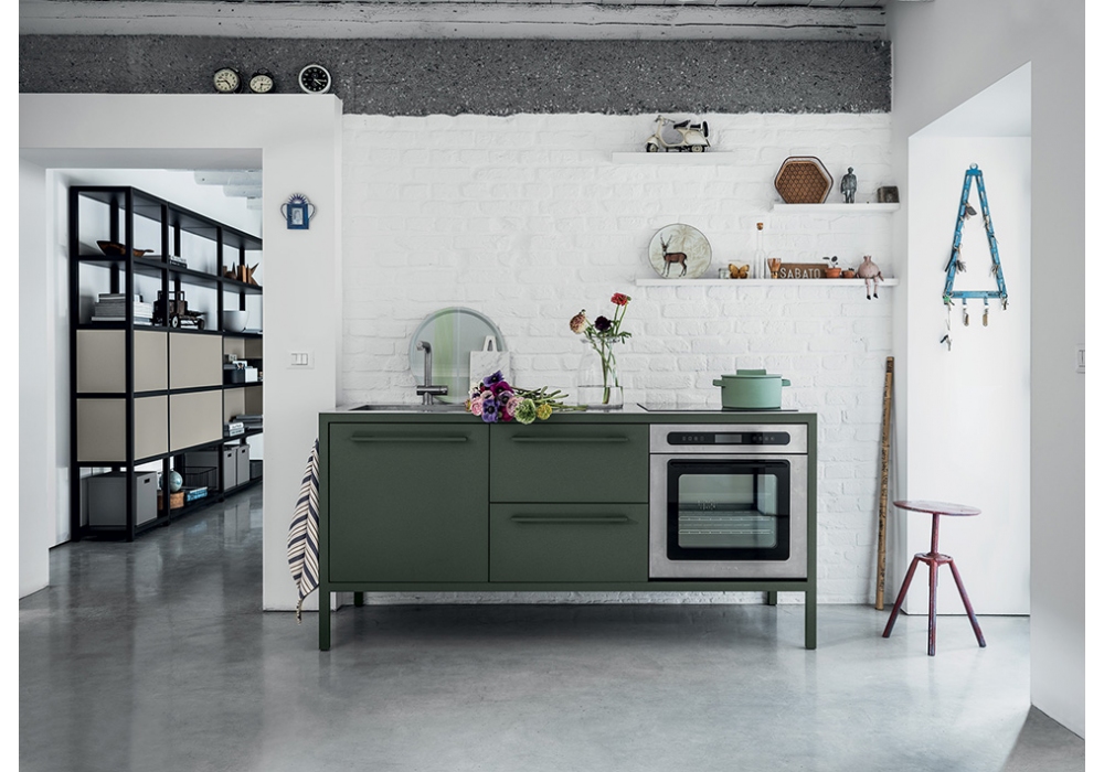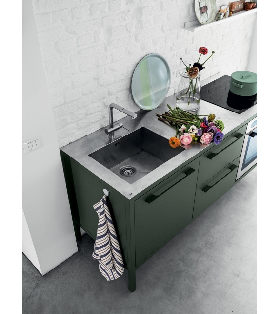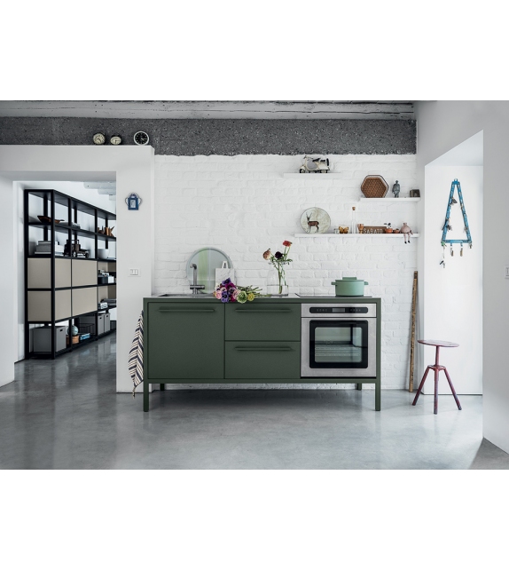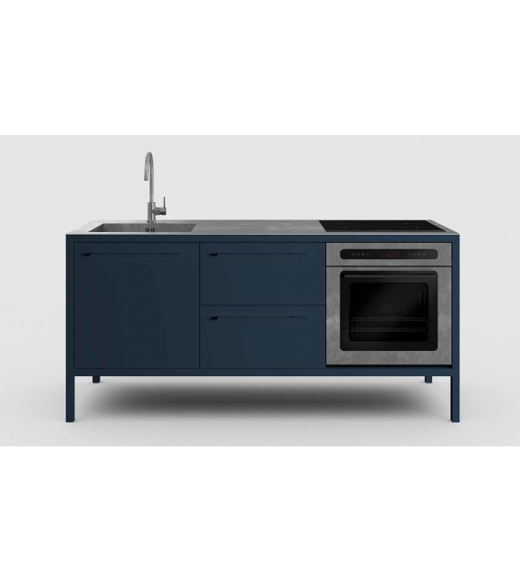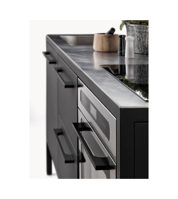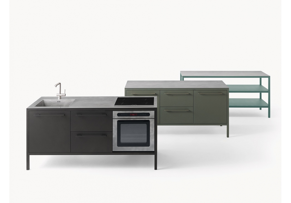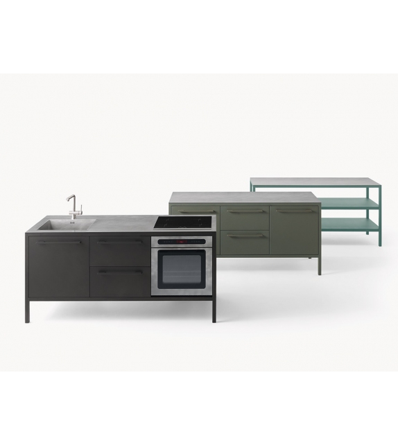 Frame Cucine e Banconi conçu par Salvatore Indriolo pour Fantin est un comptoir en métal avec la possibilité d'ajouter une plaque de cuisson pour la transformation en cuisine. Châssis porteur en vue et portes et tiroirs en clair, plateau en acier inoxydable satiné, vintage ou Fenix NTM en différentes finitions, structure disponible en différentes couleurs. Ajout d'accessoires et d'appareils disponibles et choix de diverses configurations.