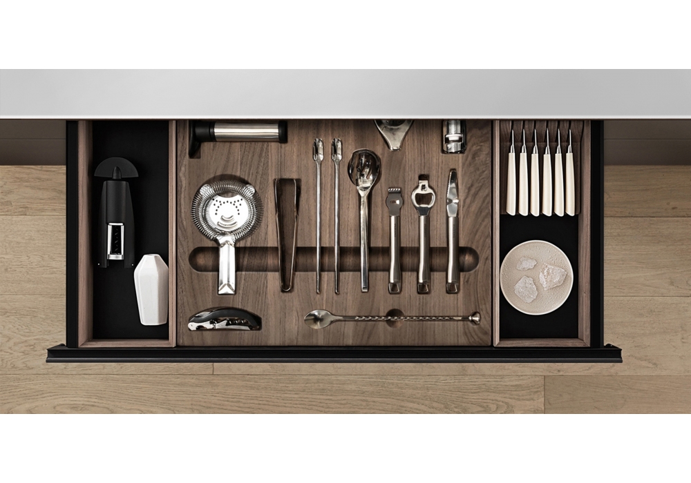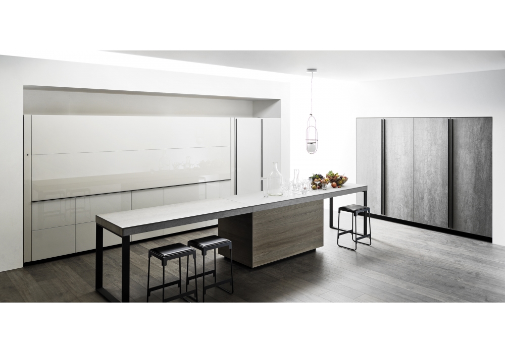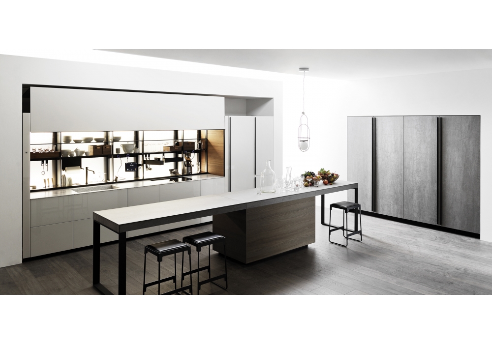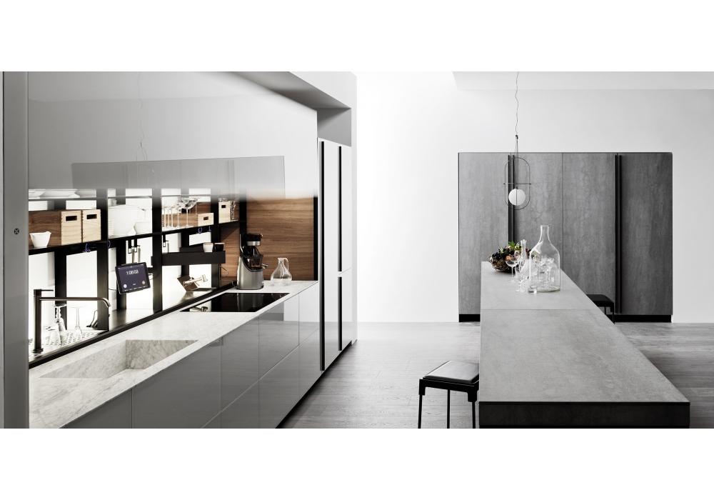 Logica Celata conçu par Gabriele Centazzo pour Valcucine est une cuisine orientée vers un design multiforme, adapté à ceux qui la vivent, construit avec des bords inclinés et micro-tournés, pour faciliter l'utilisation sans poignées, restaurant pratique et esthétique. Les plateau peuvent être en verre, stratifié, pierre ou acier. Portes en mélamine, MDF, angel skin ou de verre.
