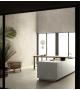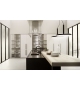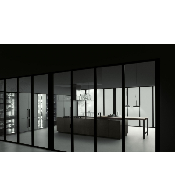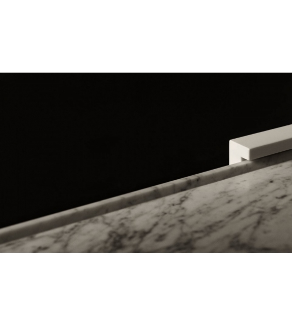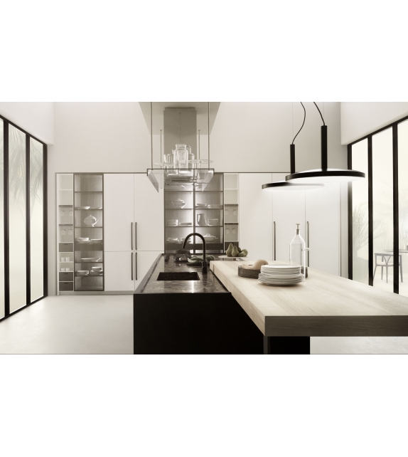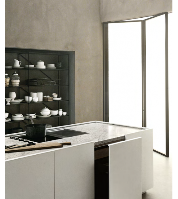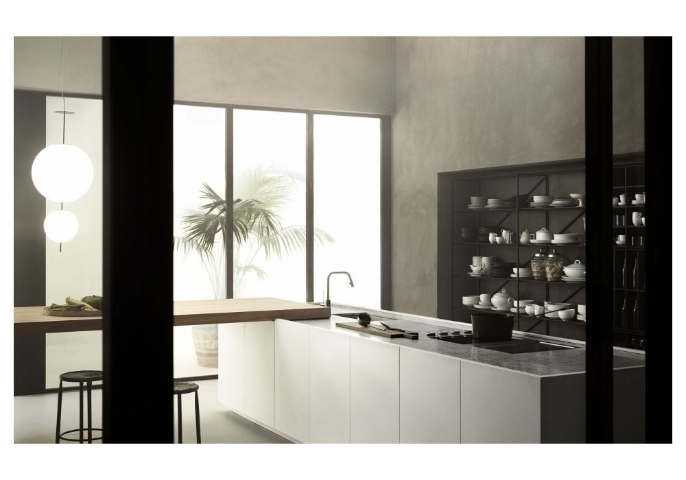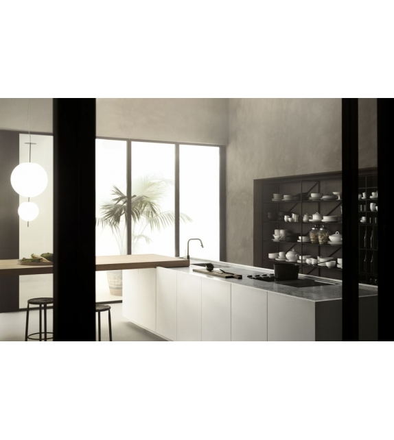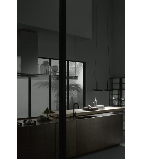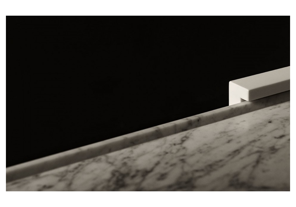 K21 conçue par Norbert Wangen est une cuisine qui se distingue par son aspect monolithique et extrêmement défini, accentué par la conformation en forme de cuve des plans de travail. En présence de tiroirs et de grands tiroirs, l'ouverture est garantie par une bande de poignée intermédiaire en aluminium extrudé.