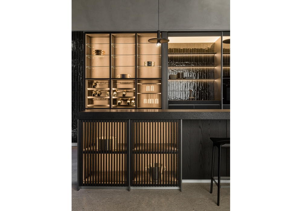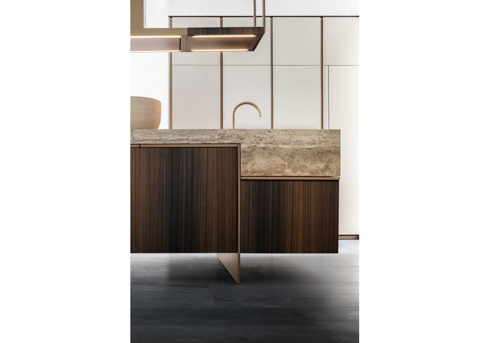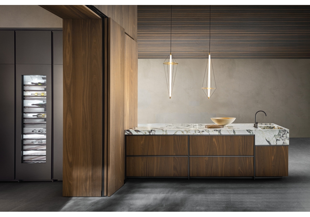 Ratio conçue par Vincent Van Duysen pour Molteni&C est une cuisine modulaire où la structure est le protagoniste : des treillis métalliques dessinent l'architecture des éléments bas, des éléments hauts, des colonnes, des hottes et des accessoires. Des volumes pleins, des volumes vides et des plateaux de différentes épaisseurs sont accrochés aux éléments techniques structuraux, créant un élégant jeu d'équilibre. Des essences raffinées telles que le thermo chêne alternent avec des pierres naturelles sophistiquées telles que la nouvelle Breccia Capraia. Enrichi par de nouvelles bases au sol, équipées de portes à lattes et d'éclairage intérieur, qui intègrent les poignées avec des profils de même épaisseur.