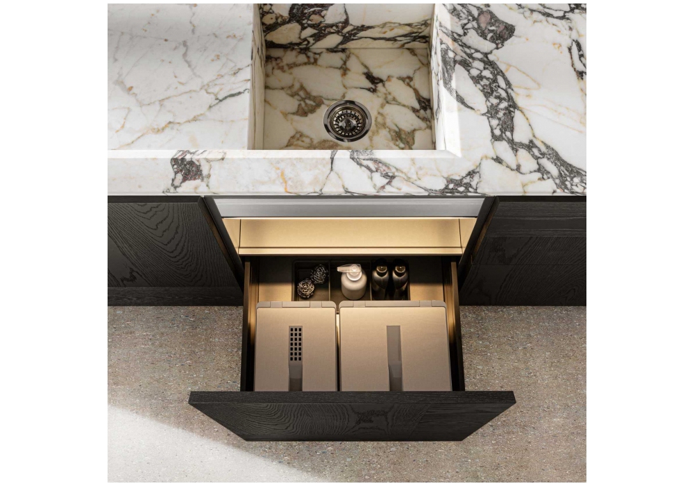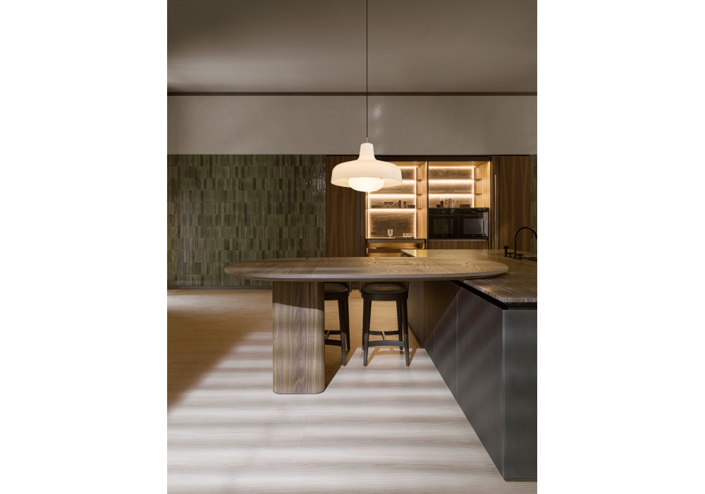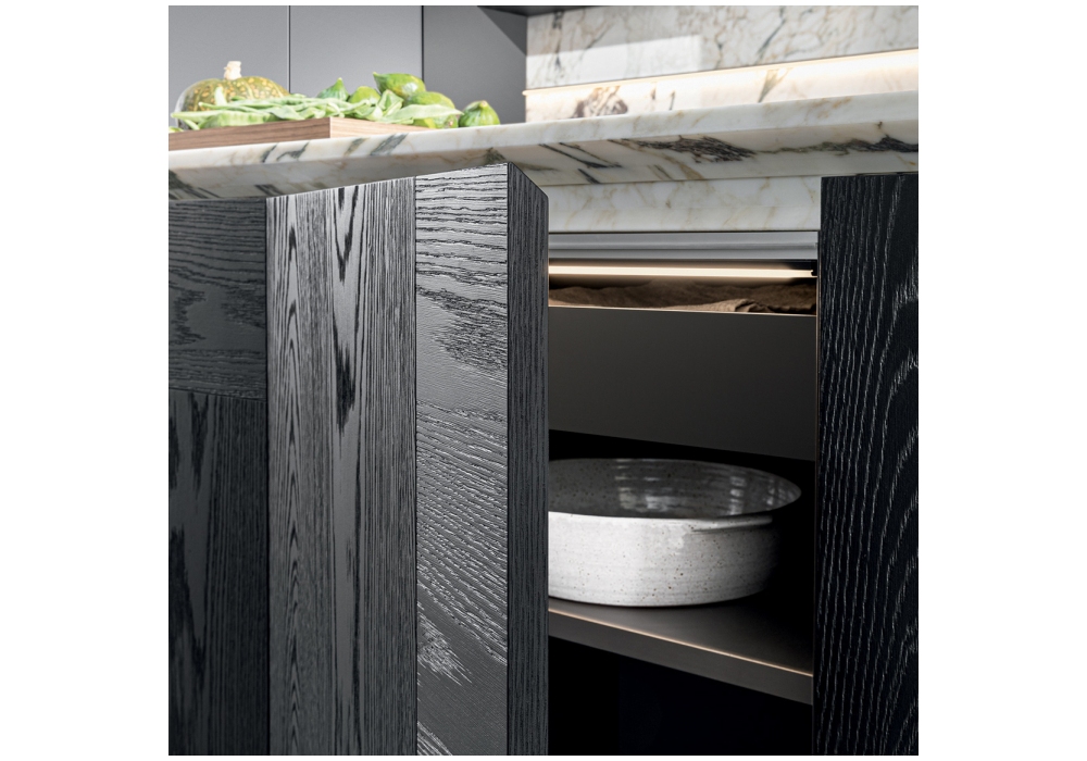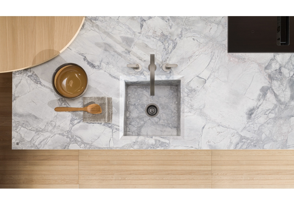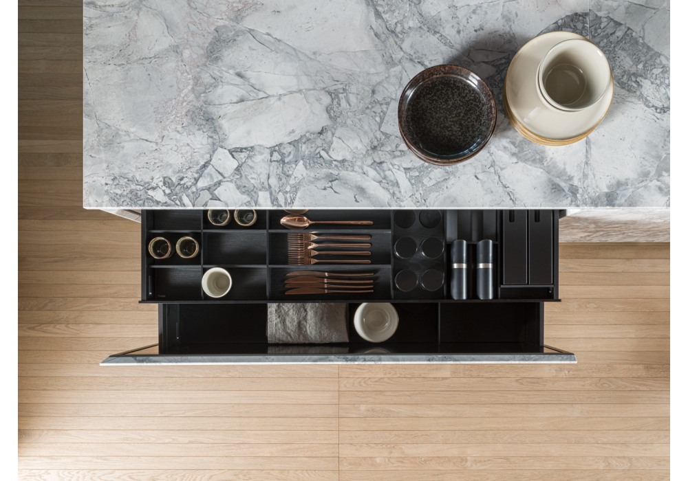 Intersection conçue par Vincent Van Duysen pour Molteni&C est une cuisine modulaire. Ce projet implique le choix d'un matériau approprié à cet effet, la pierre naturelle, toujours avec des caractéristiques uniques que la nature lui donne et, d'autre part, l'utilisation de technologies innovantes pour sa fabrication. Comme en témoignent les portes des éléments bas, qui s'ouvrent sans effort pour assurer une fonctionnalité maximale. Les dalles de pierre naturelle sont travaillées et excavées avec des procédés mécaniques de haute précision, afin d'alléger les panneaux et d'assurer leur usage domestique.