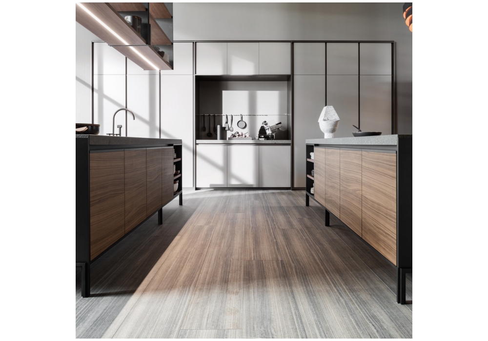 VVD conçue par Vincent Van Duysen pour Molteni&C est une cuisine sans poignée, qui repose sur le contraste entre les épaisseurs des côtés et des terminaux et les fortes épaisseurs des plans de travail, qui s'intègrent, interrompant la linéarité du plan, avec la pierre. Le projet est complété par de grands plateaux extractibles, des tiroirs ouverts et des chariots pouvant être intégrés dans les sous-planchers. L'innovation s'exprime avec des détails technologiques tels que la barre LED intégrée, le profil en aluminium qui dessine discrètement la poignée de porte, améliorant sa prise en main et la charnière pivotante innovante qui permet aux portes de s'ouvrir à 180°, rendant l'espace intérieur plus utilisable. Il acquiert un nouveau look grâce aux unités murales Bright en verre transparent, avec micro-charnière amortie.