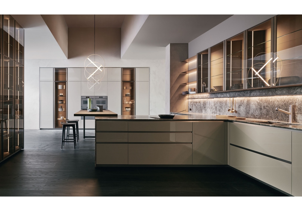 Prime conçue par Molteni&C est une cuisine caractérisée par une ouverture avec rainure. Il se décline en de nombreuses variantes de composition pour les besoins esthétiques les plus sophistiqués. La rainure traverse la cuisine sans interruption et se termine sur les hanches. La porte de Prime est façonnée en haut à 45° pour rendre l'ouverture plus facile et plus ergonomique. Le projet comprend également la porte en verre dans les finitions bronze et fumée pour les éléments hauts et les colonnes Flair, tous deux éclairés par des profils LED cachés dans les côtés des modules, et le nouveau système Wing avec étagères, en aluminium.