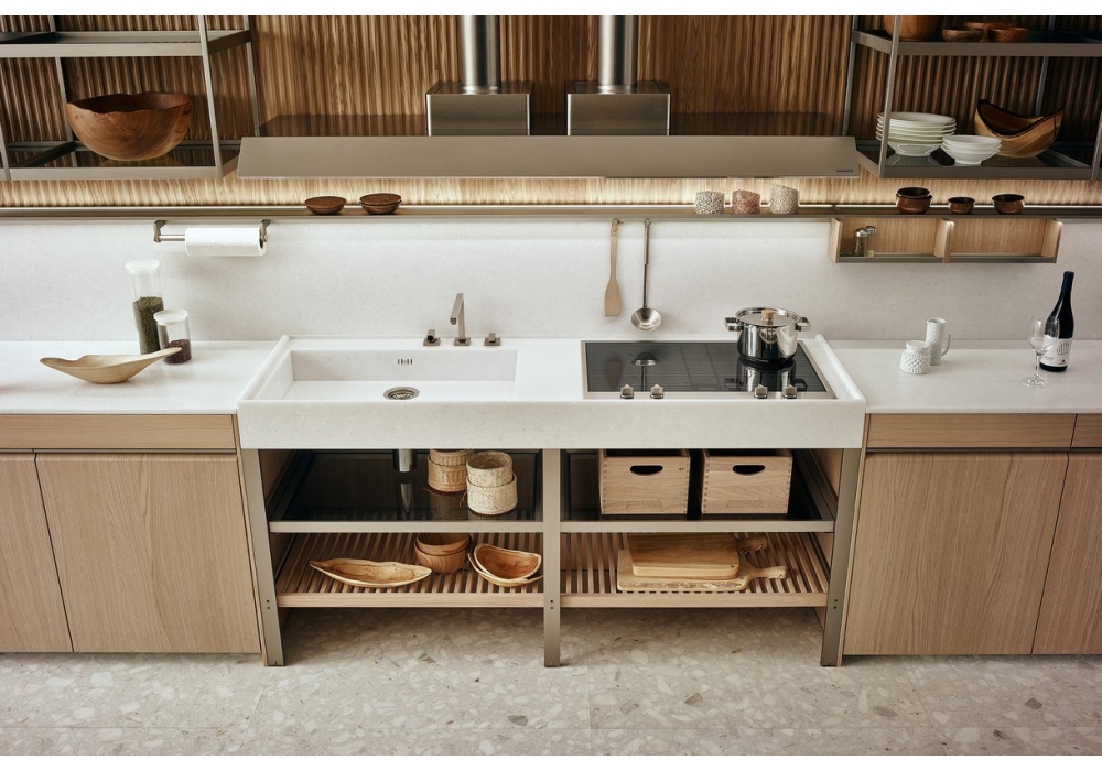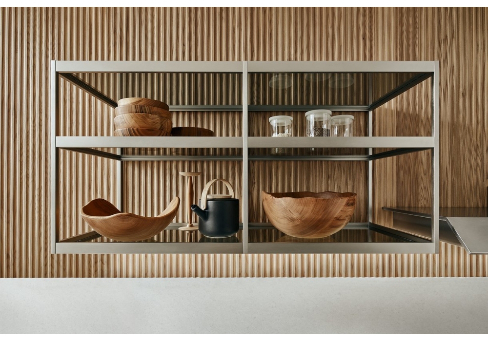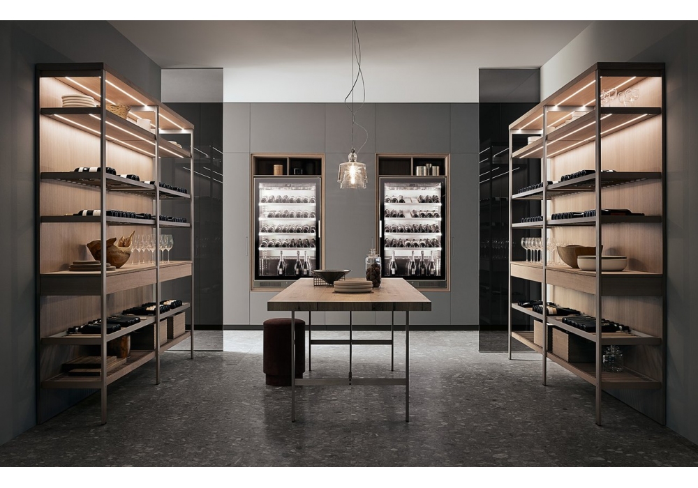 K-lab 04 conçue par Ernestomeda est une cuisine avec système K suspendu, un système modulaire ouvert composé d'épaulements verticaux en acier sur lesquels reposent des profils horizontaux en aluminium pour soutenir les étagères. K-Lab peut être enrichi d'une élégante cave qui s'intègre dans le système de cuisine et devient son extension, créant un cadre de vie parfait.