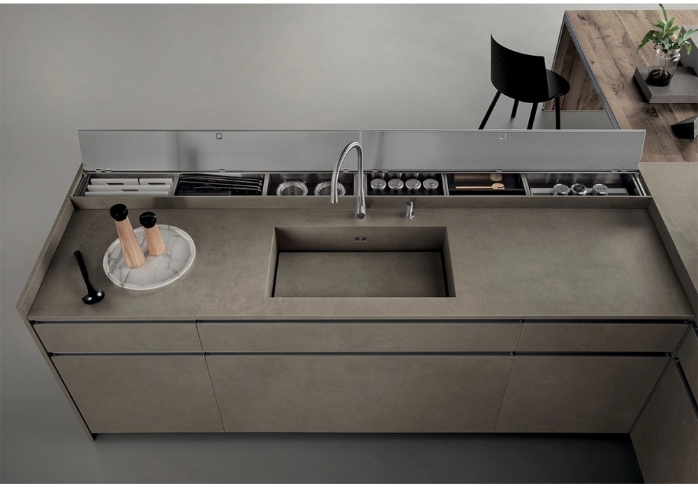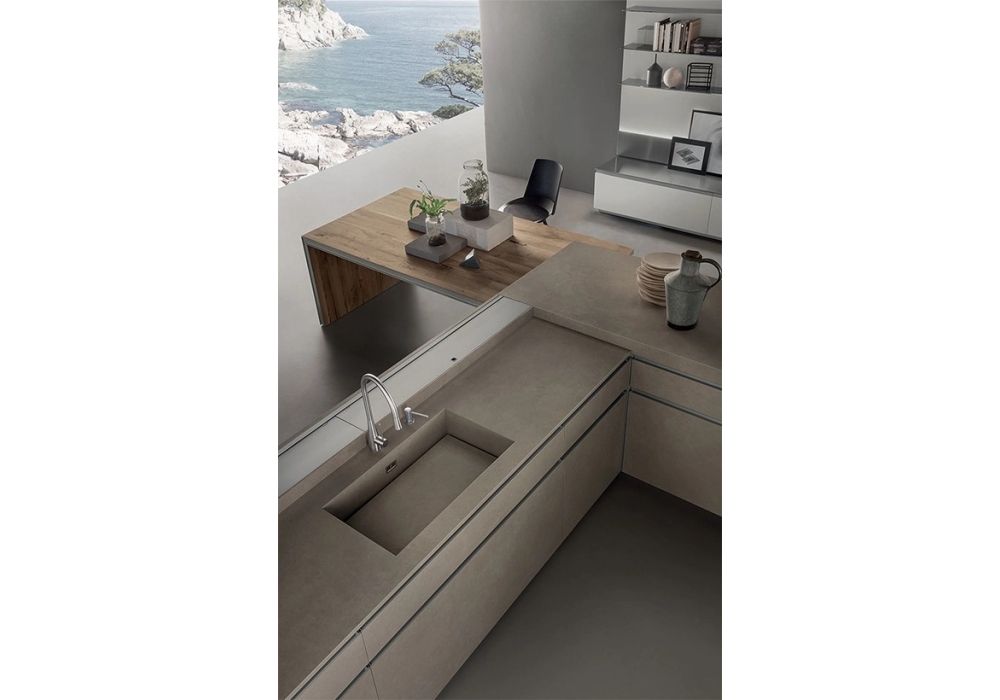 Icon 02 conçue par Ernestomeda est une cuisine avec une péninsule Evolution pouvant être utilisée comme espace snack dans la version fermée et table à manger dans la version ouverte, plan de travail Union avec vasque intégrée, espace de vie "Set" composé de boiseries pouvant être équipé d'étagères et d'éléments suspendus de différentes dimensions.