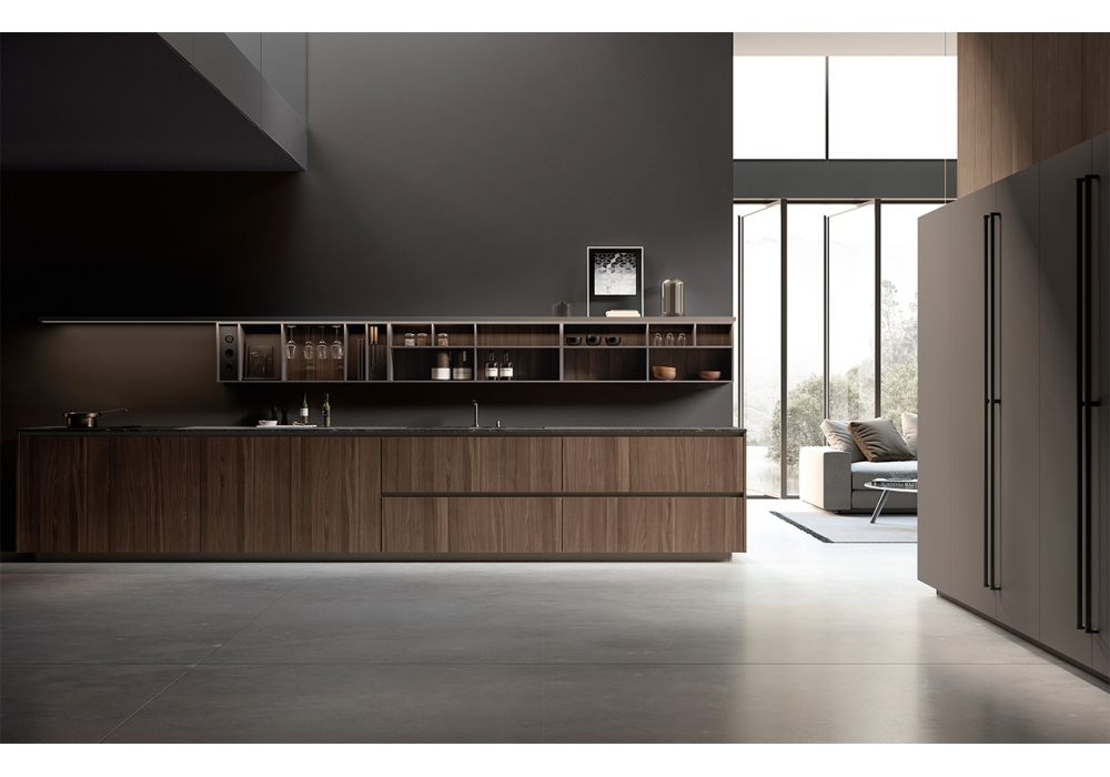 One 01 conçue par Ernestomeda est une cuisine linéaire au design contemporain. Les éléments ouverts équipés et les armoires spacieuses à effet monolithique permettent une gestion optimale de l'espace.