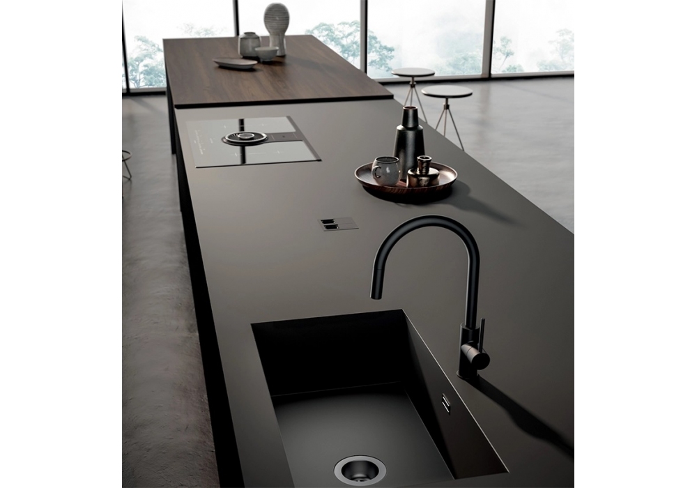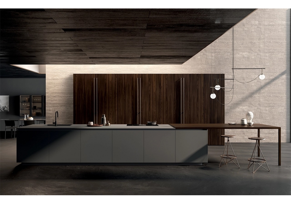 One 02 conçu par Ernestomeda est une cuisine. La structure en îlot caractérise cet environnement raffiné et chaleureux, répondant au besoin de convivialité, dans un dialogue harmonieux entre chromatismes, finitions et essences précieuses.