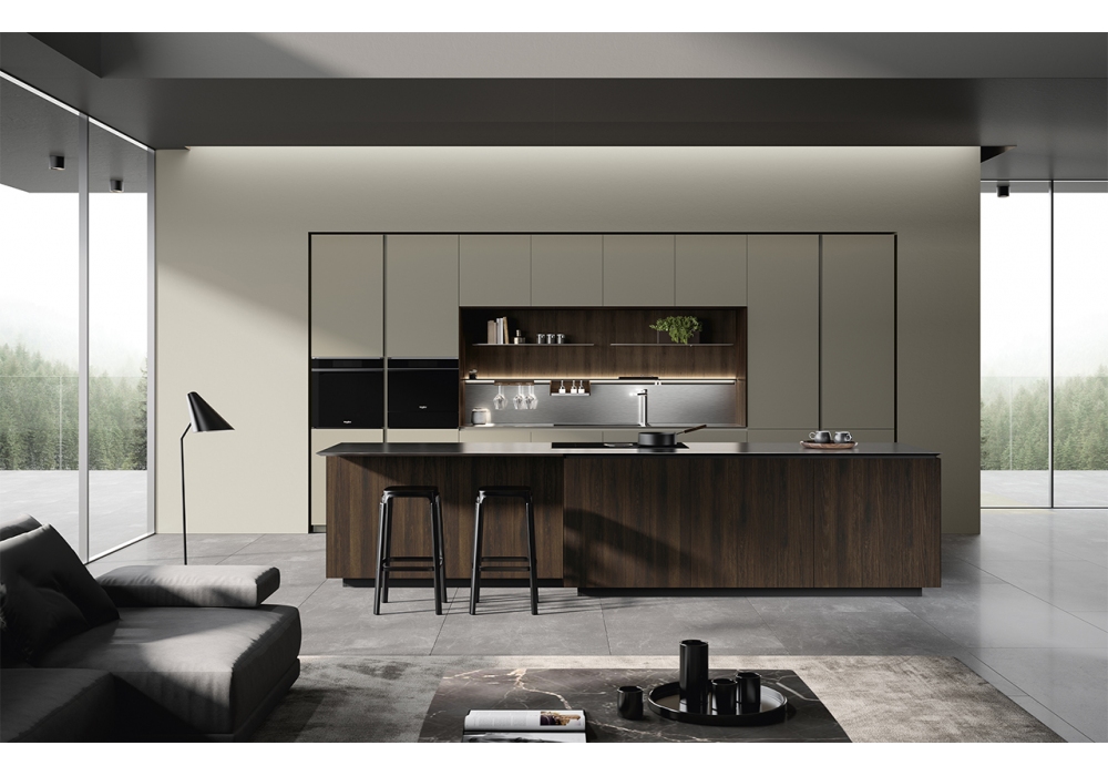 Obliqua 03 conçue par Ernestomeda est une cuisine enrichie d'étagères Clever et Order, la niche opérative dialogue avec l'îlot compact et fonctionnel. Plan de travail en hi-mélaminé Midland et éléments bas en placage chêne thermo-traité.