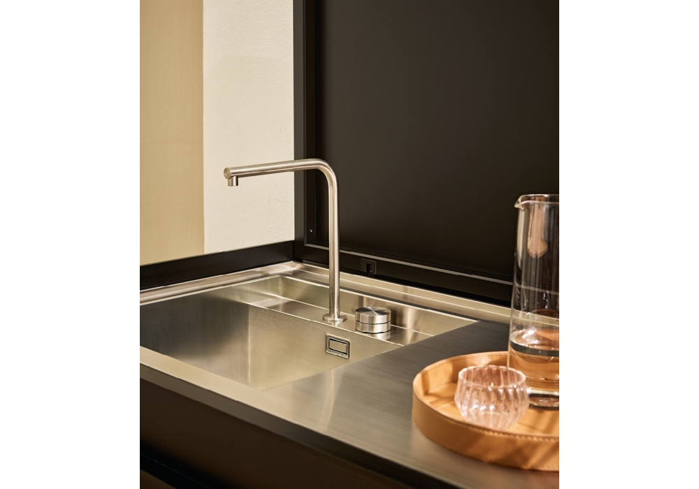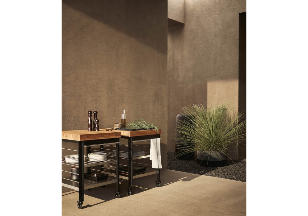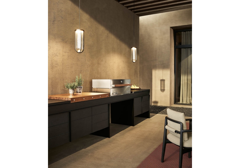 Land conçue par R&D Poliform et Cap est une cuisine d'extérieur composée d'une série de modules accrochés à des poutres longitudinales qui la font apparaître suspendue. Disponible en deux versions murales ou autoportantes, et en aluminium, Inalco MDi® et acier, matériaux adaptés à une utilisation en extérieur. Il ne nécessite aucun raccordement électrique, car toutes les fonctions sont alimentées au gaz ou à piles, et il est équipé d'un évier, d'une planche à découper et d'un barbecue.