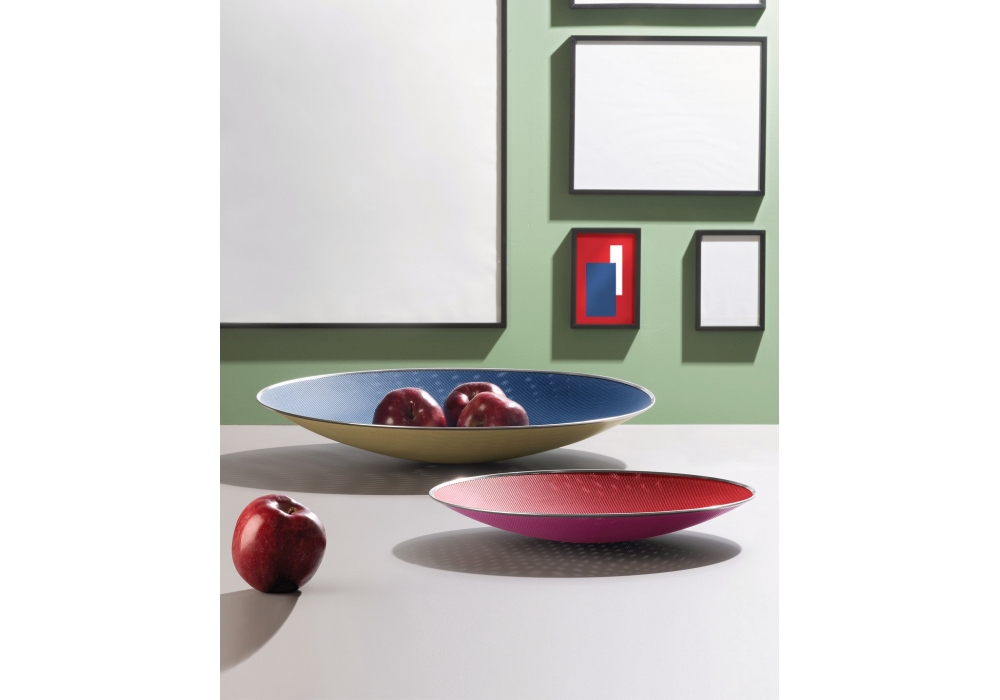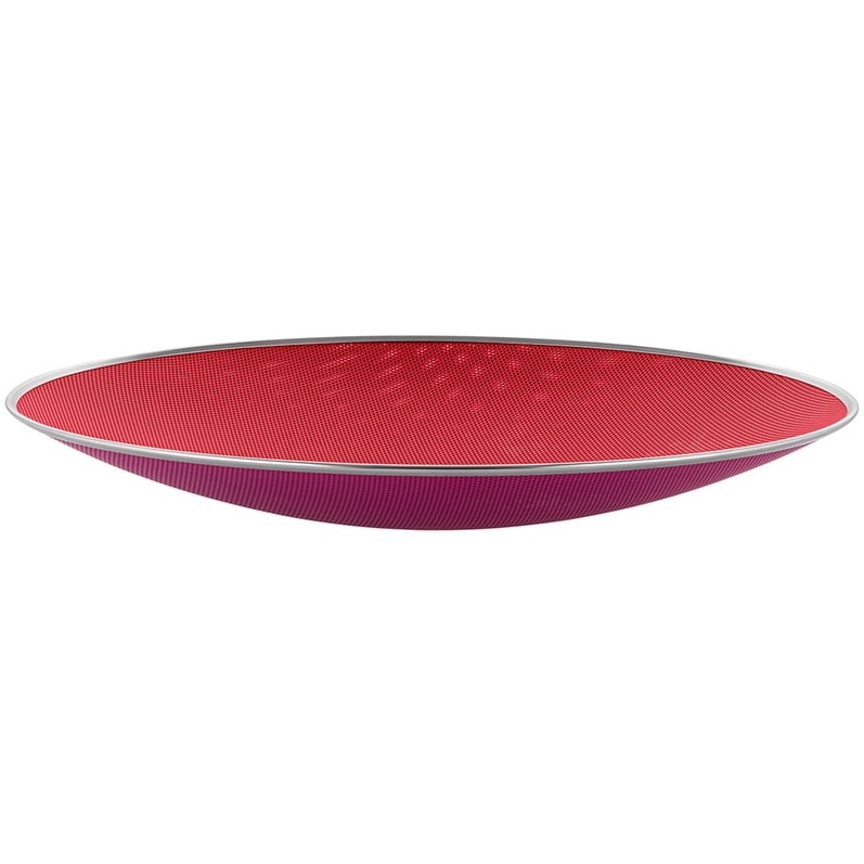 Cohncave conçu par Susan Cohn pour Alessi est un centre de table ajouré en acier inoxydable coloré à la résine époxy. Disponible dans les versions suivantes : rouge et violet dans la plus petite taille ou bleu et ivoire dans la plus grande.
