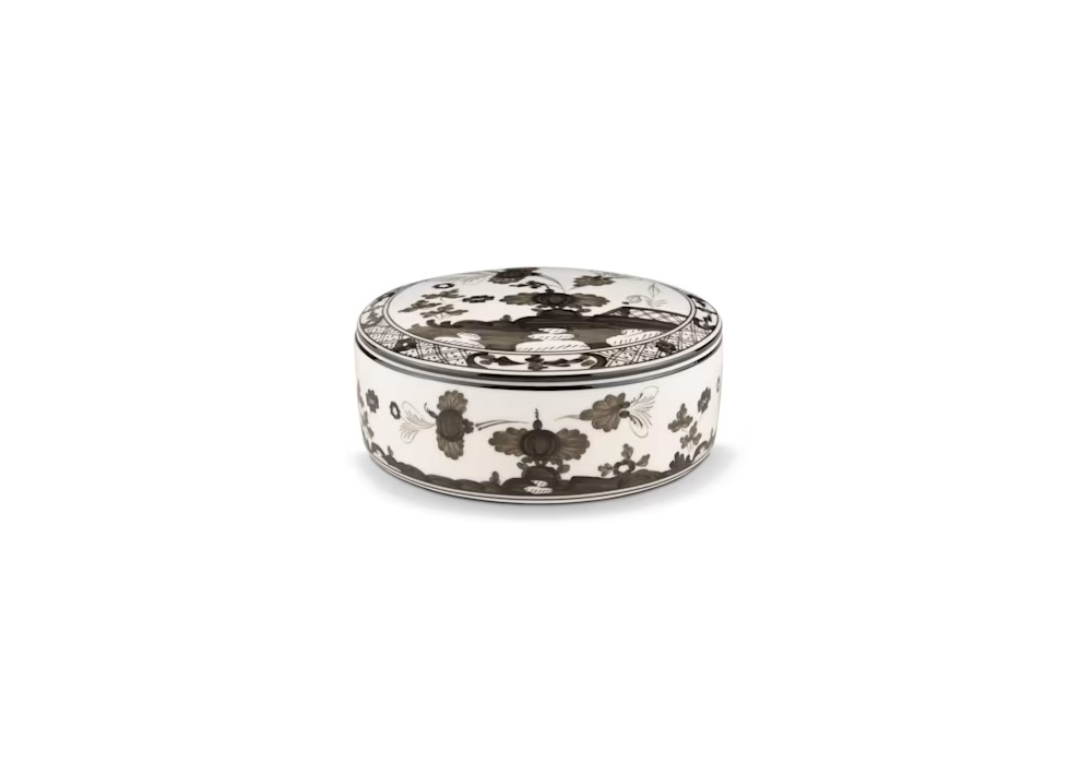 Scatola Talco Oriente Italiano Albus conçue par Ginori 1735 est une boîte ronde décorée avec couvercle.